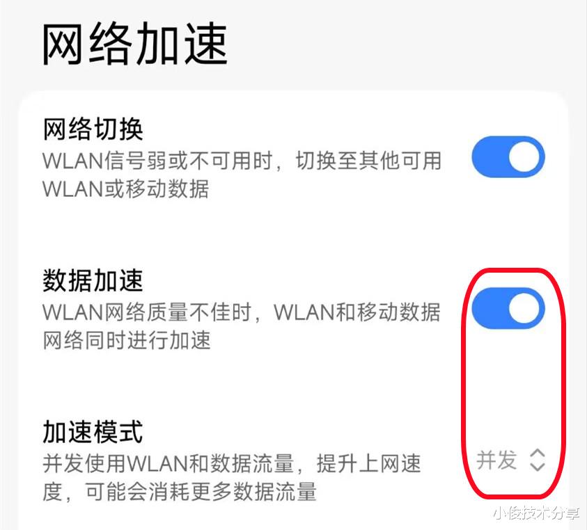 接下来第二步,我们在设置里面找到【wifi】设置点进去,接着在这里啊,也有一个网络加速,在网络加速里面,咱们可以对手机上面安装的应用软件,进行单独加速,那大家看到了没,下面有一个数据加速,我们把它打开,打开之后,在wifi信号不好的时候,就会使用手机上面的数据进行加速,从而就不会出现网速慢的问题了!