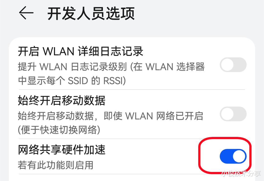 点开开发者选项之后,我们往下翻,直到找到网络共享硬件加速这个开关为止,大家看到没有,这个按钮呀,默认都是关掉的,这个就是咱们的信号增强开关了,我们一定要把这个开关打开,打开以后呀,这个信号就会增强了啊。
