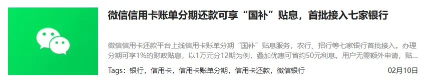 微信信用卡还款平台宣布,正式上线信用卡账单分期「国补」贴息服务。