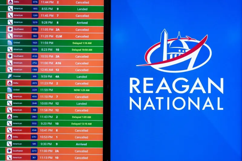 里根机场大屏幕上显示,事故发生后很多航班被迫取消。