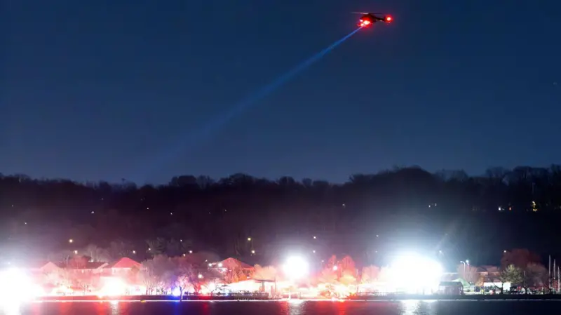 BBC记者在弗吉尼亚州北部机场对面的楼顶上远眺事发地,能清楚听到警笛,并看到两架直升机包围坠机现场。