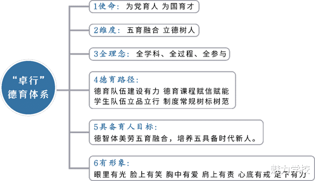 学校坚持“立德树人 全面发展”育人方向,构建“123456卓行德育”工作体系,践行三全五育理念,以六百德育课程、12个主题月、3大文化节为载体,落实三段成长目标,深入落实《中小学德育工作指南》任务、路径要求,聚焦健康学校建设,将养成教育与心理健康融入育人全过程,培根铸魂,赋能成长。