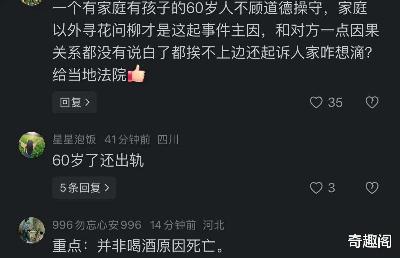 对此,网友也展开讨论,发表各自的看法和意见。一位网友说男方家属有点过分了,八杆子打不着也想着讹钱;还有网友表示,年龄这么大了,有妻有女,还和年轻女子暧昧,道德方面本就有问题,家属要赔偿更不对。对此,大家怎么看呢?