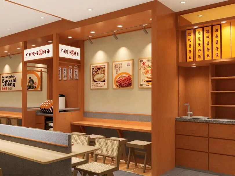 品牌持续进行门店形象升级,以“橙+米白”为主视觉,融合广式情怀与现代审美。明档厨房设计、舒适明亮的用餐环境,让顾客在品尝美食的同时,亲眼见证制作过程,强化了“匠心”“透明”的品牌印象,提升消费信任与体验感。