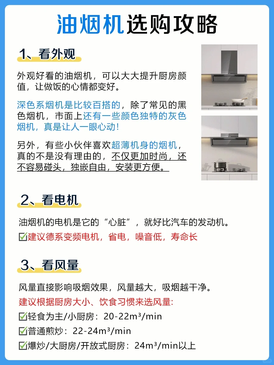 风量直接影响吸烟效果,风量越大,吸烟越干净。可以根据厨房大小、饮食习惯来选风量,建议选择22m³/min以上的