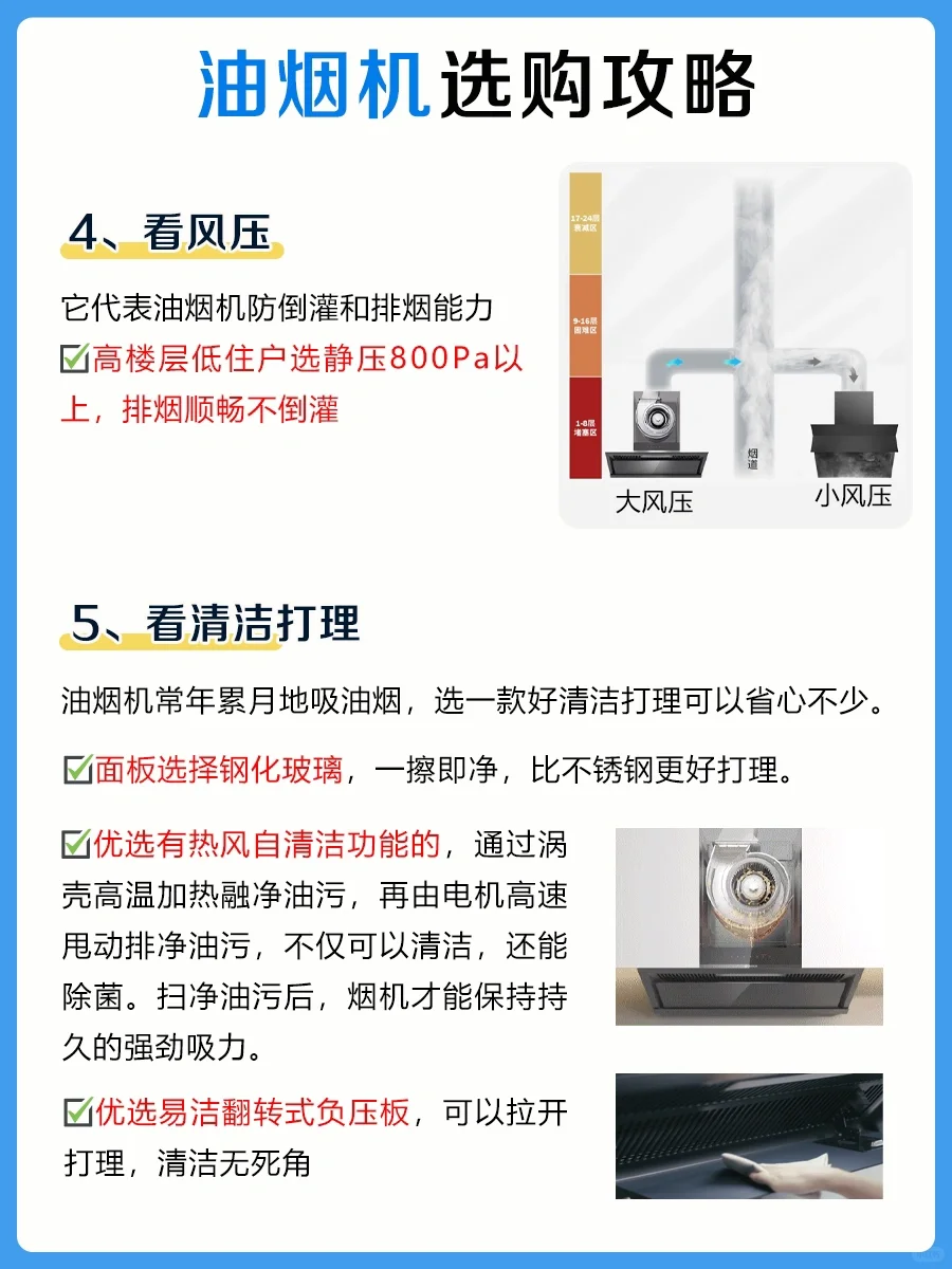 ✅优选有热风自清洁功能的,通过涡壳高温加热融净油污,再由电机高速甩动排净油污,不仅可以清洁,还能除菌。扫净油污后,烟机才能保持持久的强劲吸力。