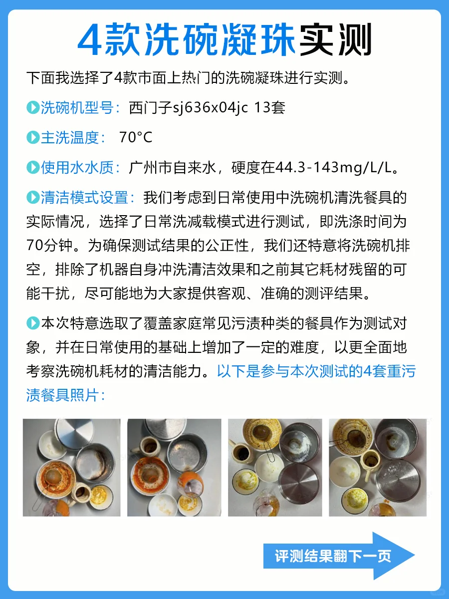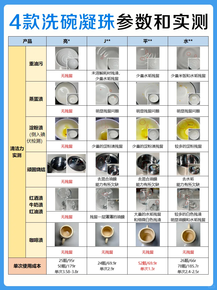 测试了市面上四款热门洗碗凝珠,亮碟洗碗凝珠对重油污、蒸蛋渍、淀粉渍、顽固烧结、红酒渍、牛奶渍、红油渍、咖啡渍都能强力清洁,确保餐具光洁无水渍,洗碗机内部干净明亮