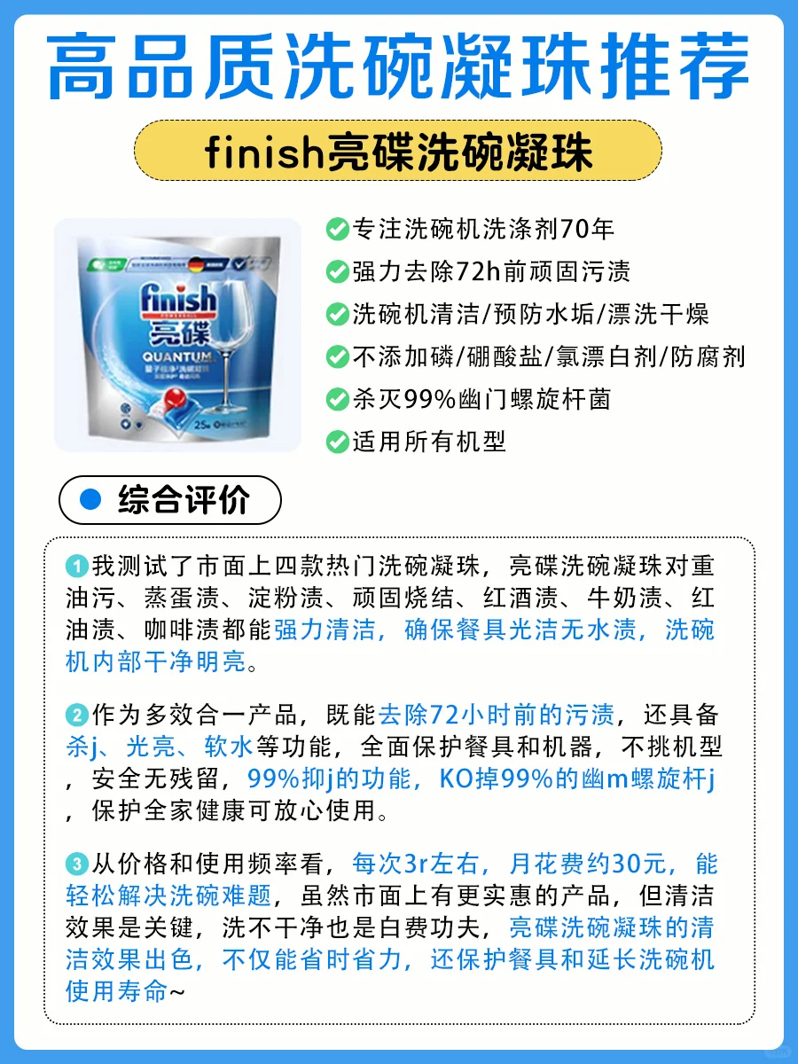 从价格和使用频率看,每次3r左右,月花费约30元,能轻松解决洗碗难题,虽然市面上有更实惠的产品,但清洁效果是关键,洗不干净也是白费功夫,亮碟洗碗凝珠的清洁效果出色,不仅能省时省力,还保护餐具和延长洗碗机使用寿命~