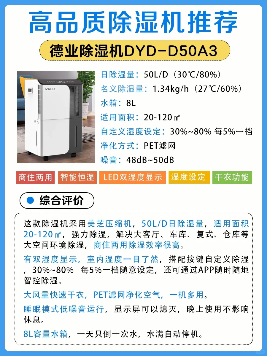 👉🏻给姐妹们推荐德业除湿机DYD-D50A3,它采用美芝压缩机,50L/D日除湿量,适用面积20-120㎡,强力除湿,解决大客厅、车库、复式、仓库等大空间环境除湿,商住两用除湿效率很高。