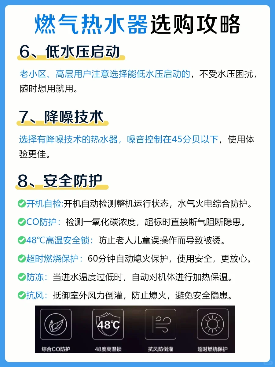 选择有开机自检、CO防护、48℃高温安全锁、超时燃烧保护、防冻、抗风等综合防护的。