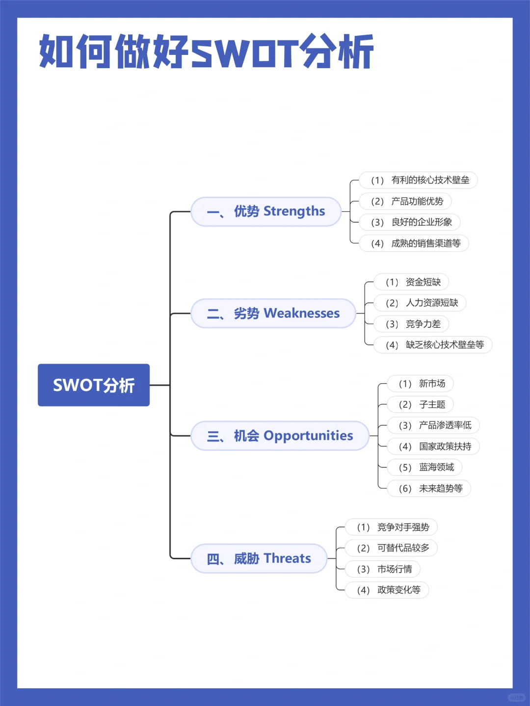 🌟SWOT 分析:分析自身优势、劣势,以及外部机会、威胁,找到发展方向。