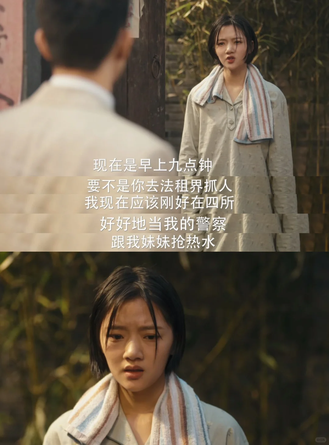 这段女主开门时的造型,湿湿的头发、毛巾随意搭在肩膀上,特别生活化。