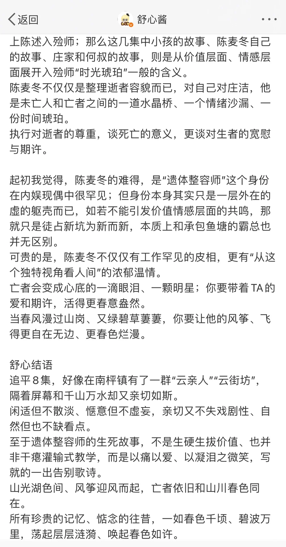 你看,归根结底,陈麦冬所为所言,皆可归为“节哀”二字,但不是流程化、制式化、重复太多次所以失却本真面目的那种,而是以血泪真心、趟过伤痛走过生死的“节哀”。