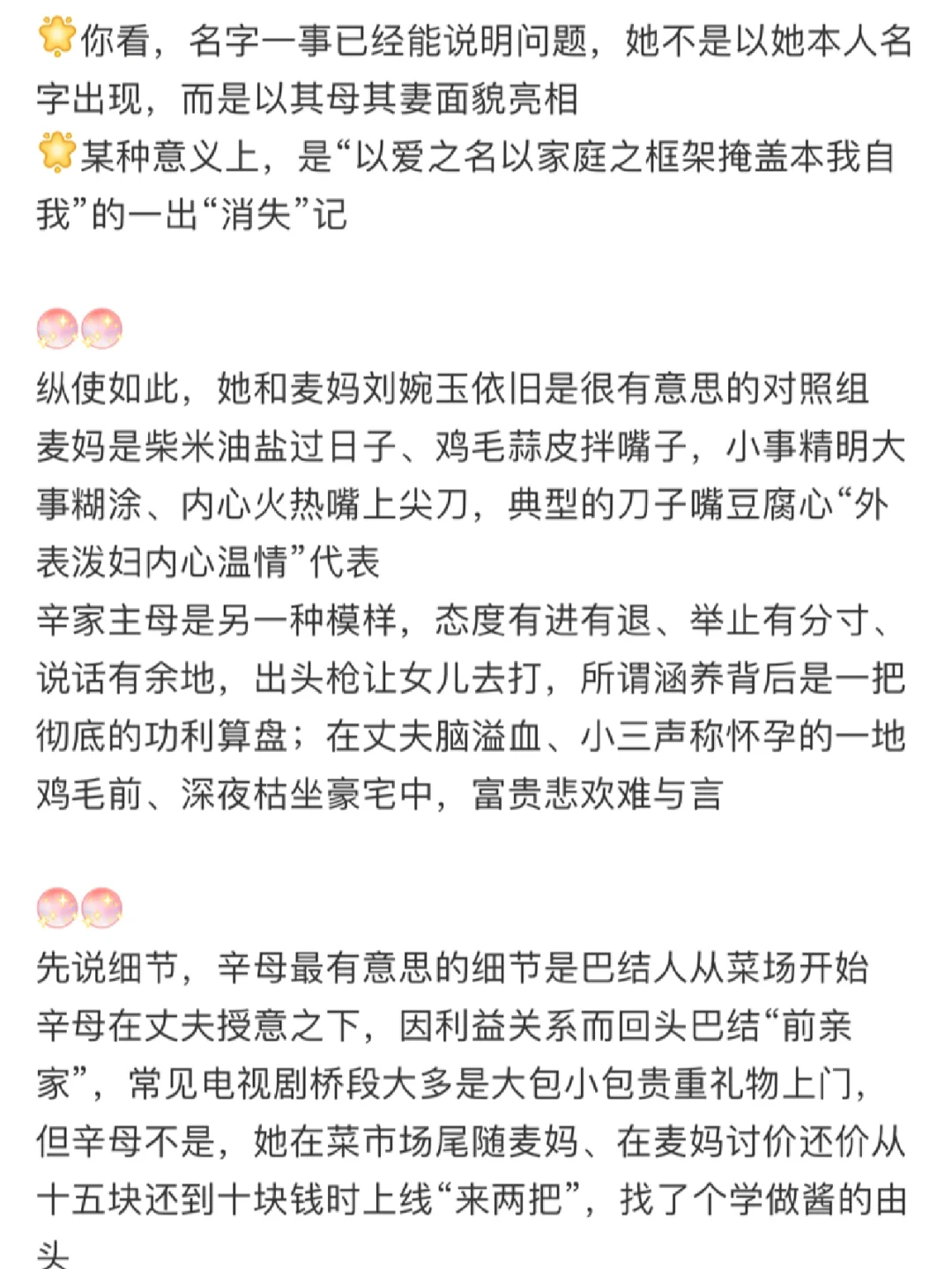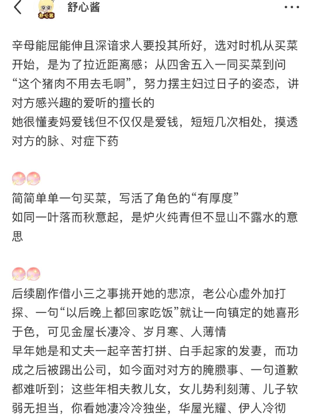 辛家主母是另一种模样,态度有进有退、举止有分寸、说话有余地,出头枪让女儿去打,所谓涵养背后是一把彻底的功利算盘;在丈夫脑溢血、小三声称怀孕的一地鸡毛前、深夜枯坐豪宅中,富贵悲欢难与言