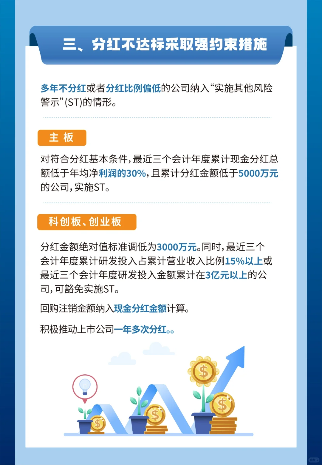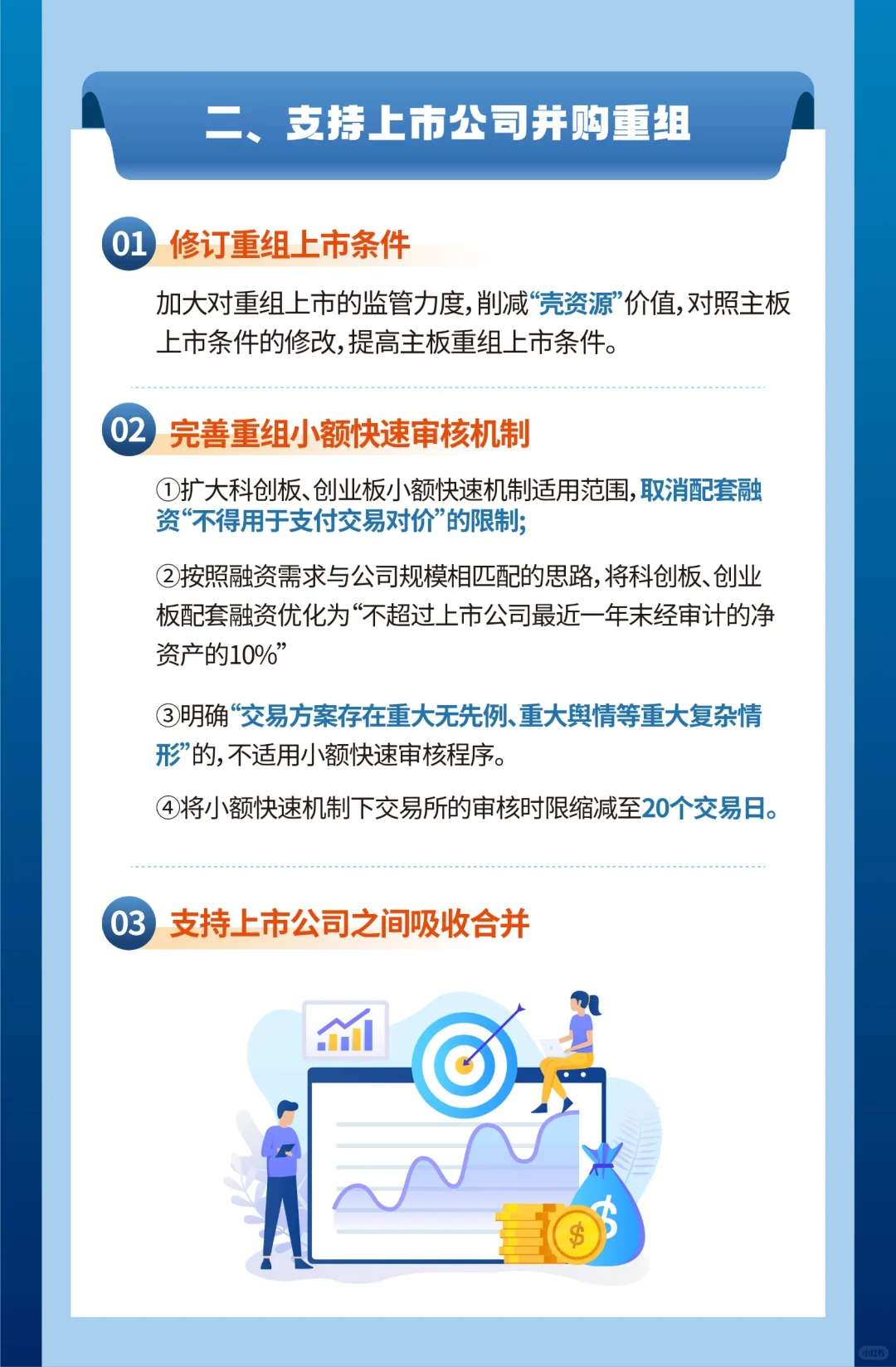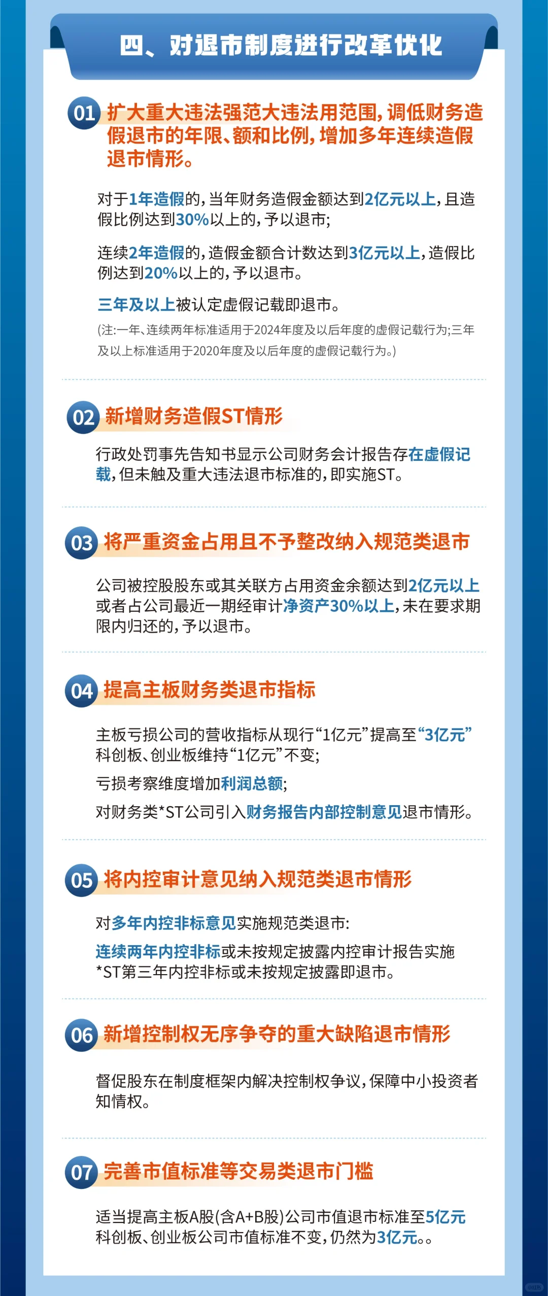 这里面有主板和创业板上市标准的适度提高哦,还支持上市公司通过并购重组提升投资价值,同时优化完善了股份减持制度,对分红不达标的会采取强约束措施,当然还有很重要的优化退市制度改革。👏