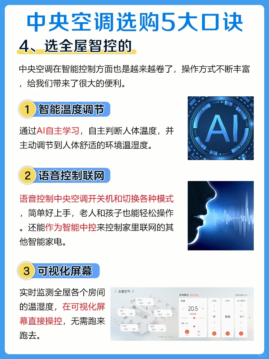 中央空调在智能控制方面也是越来越卷了,操作方式不断丰富,有智能温度调节、语音控制联网、可视化屏幕等,给我们带来了很大的便利。