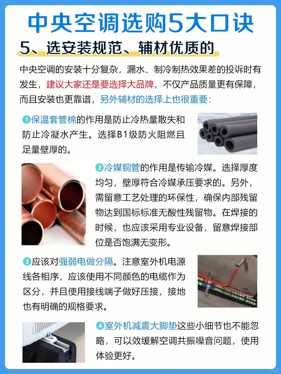 中央空调的安装十分复杂,漏水、制冷制热效果差的投诉时有发生,建议大家还是要选择大品牌,不仅产品质量更有保障,而且安装也更靠谱,另外辅材的选择上也很重要。