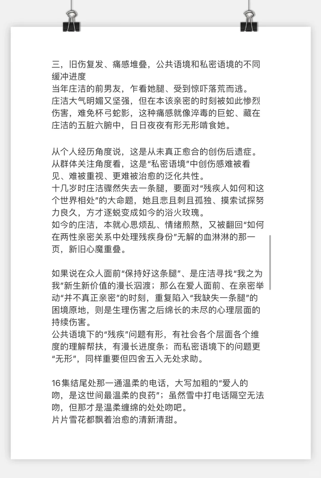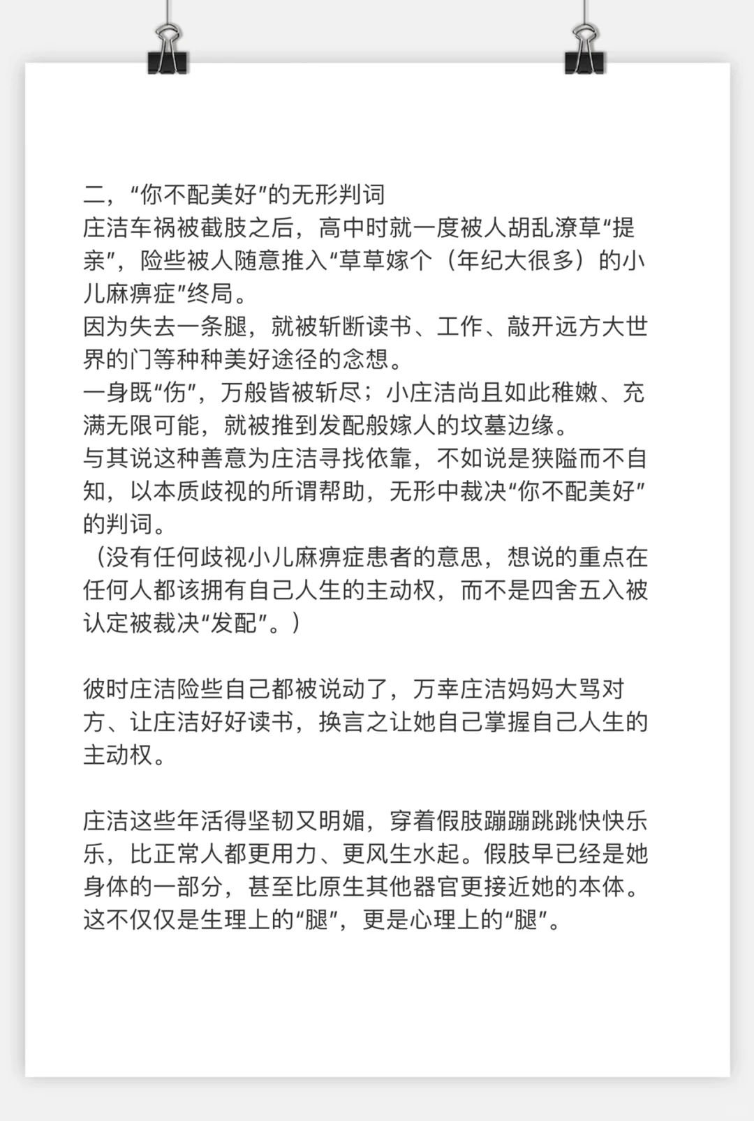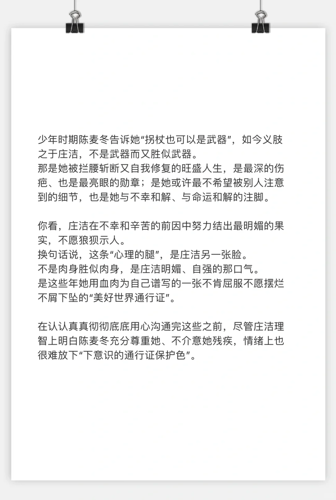 庄洁这一路,远比常人更辛苦,纵使明媚如她也需要安慰需要支持,这些年一直是她轴心后盾的母亲、突然因为过度担忧而成了她的“拦路虎”,庄洁大概比以往更迫切需要证明“我的腿完全不是问题”。