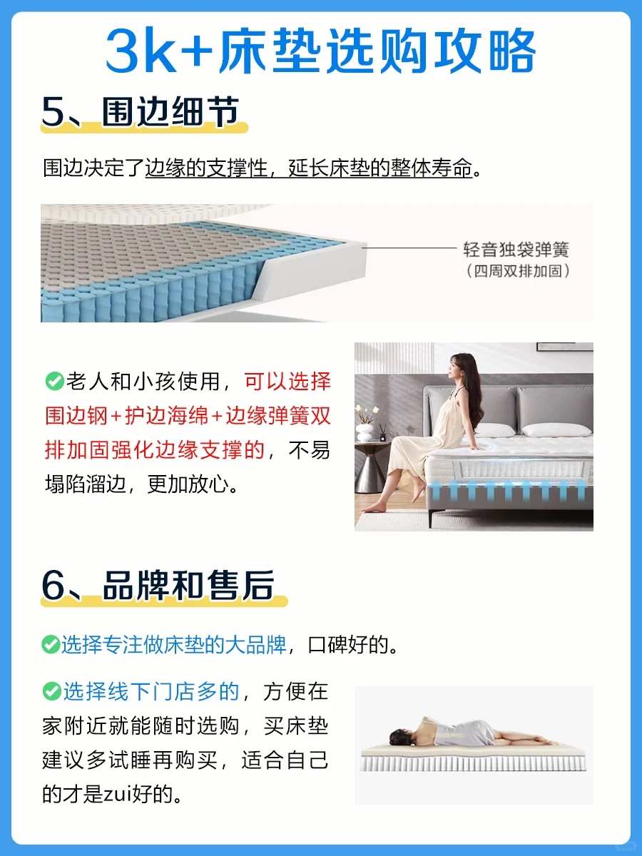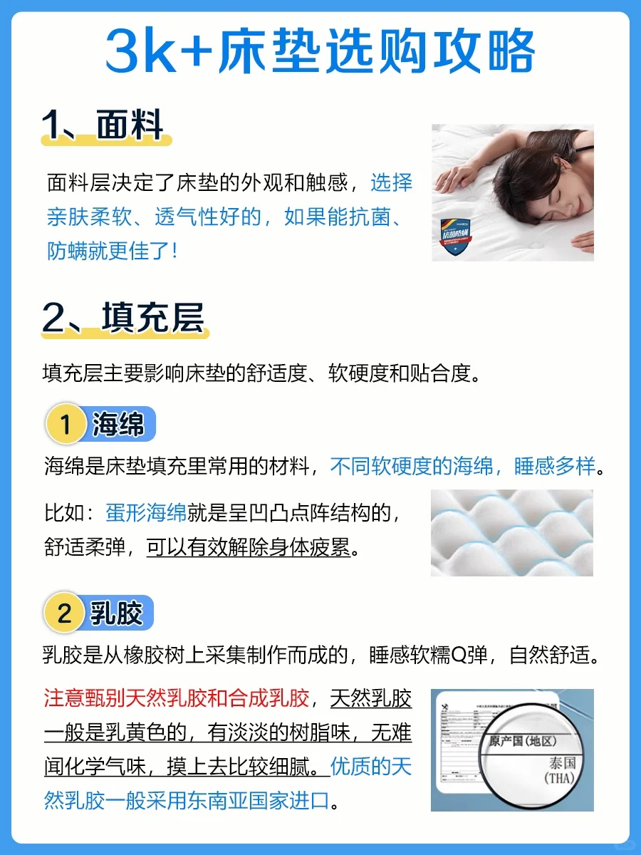想要睡眠💤质量好,床垫很关键,但怎么才能选到一张好床垫?可不是越贵越好哦!👉🏻下面从面料、填充层、支撑层、睡感、围边细节、品牌和售后6个方面,手把手教你怎么选床垫,看买再买不翻车哦!
