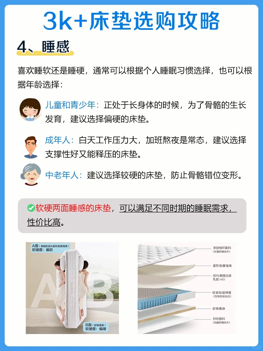 喜欢睡软还是睡硬,通常可以根据个人睡眠习惯选择,也可以根据年龄选择: