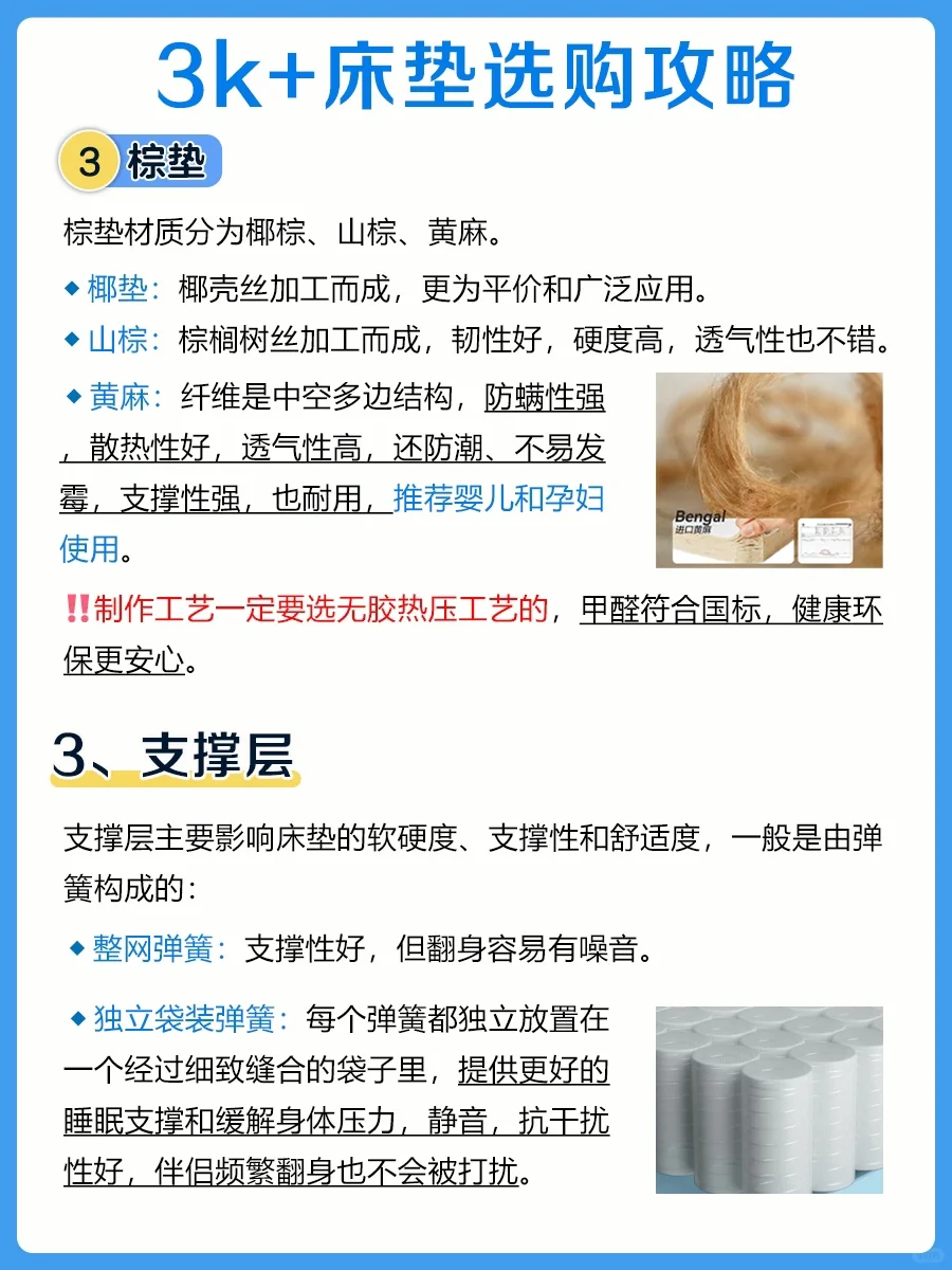✅选择黄麻,防螨性强,散热性好,透气性高,还防潮、不易发霉,支撑性强,也耐用,推荐婴儿和孕妇使用。