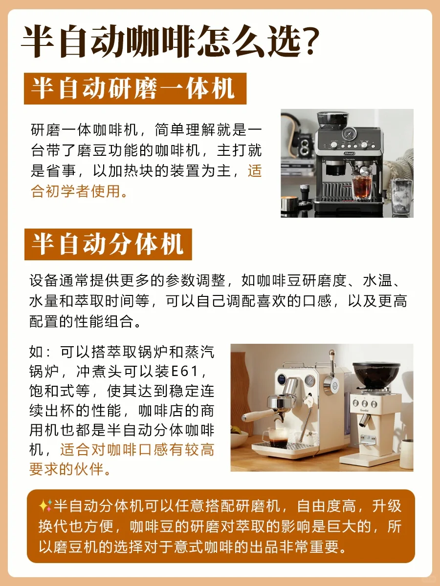 我更偏爱❤️选意式半自动咖啡机,操作性和可玩性更强。