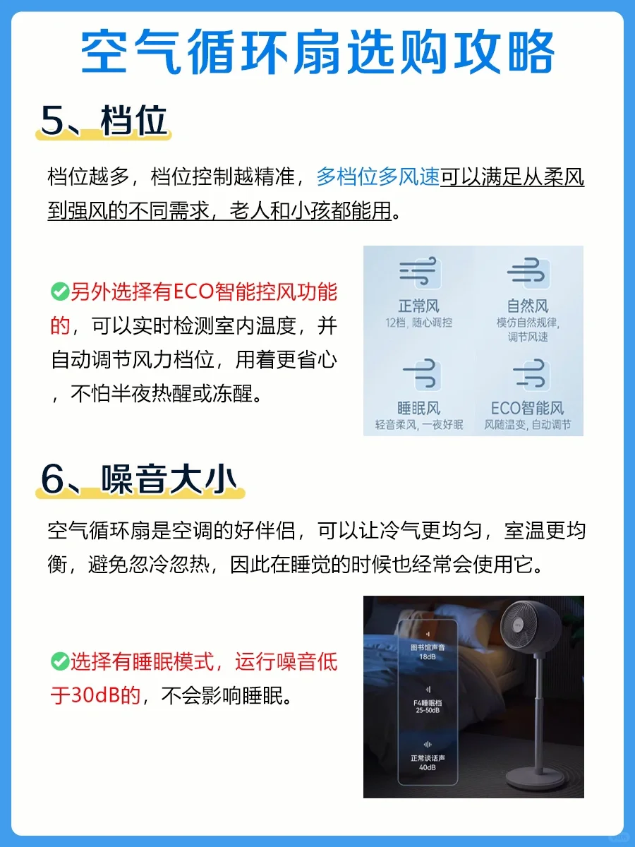 ✅另外选择有ECO智能控风功能的,可以实时检测室内温度,并自动调节风力档位,用着更省心,不怕半夜热醒或冻醒。