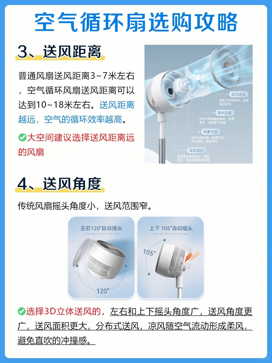 ✅选择3D立体送风的,左右和上下摇头角度广,送风角度更广,送风面积更大,分布式送风,凉风随空气流动形成柔风,避免直吹的冲撞感。