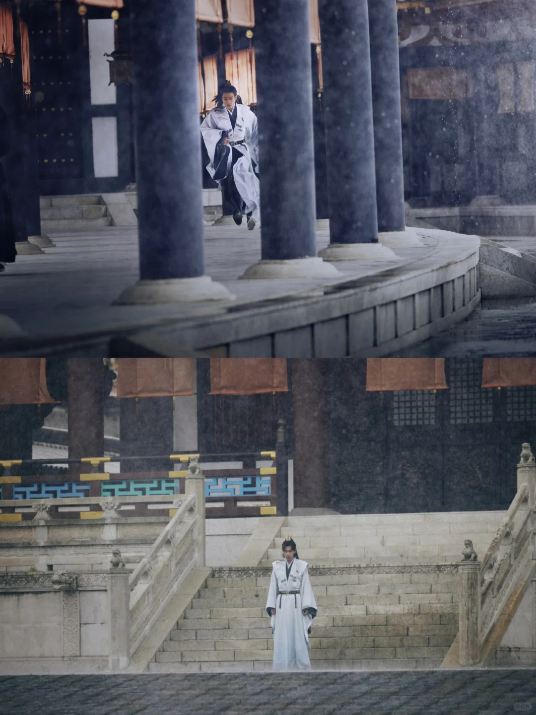 范闲疯狂跑向行刑处,平常上朝时热热闹闹的回廊、如今寂寂杳杳,偌大一个宫殿、只余三三两两小太监。阴雨绵绵、长空黯黯,巍峨宫殿的庄严、对比范闲的慌乱疾驰,像山岳般沉默的巨兽,吞噬范闲的血肉。