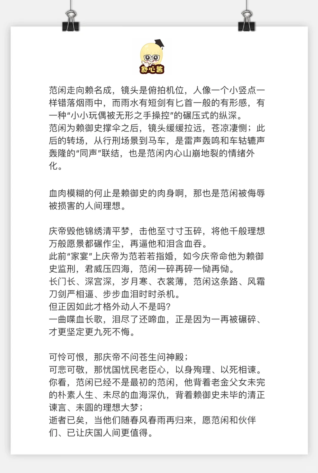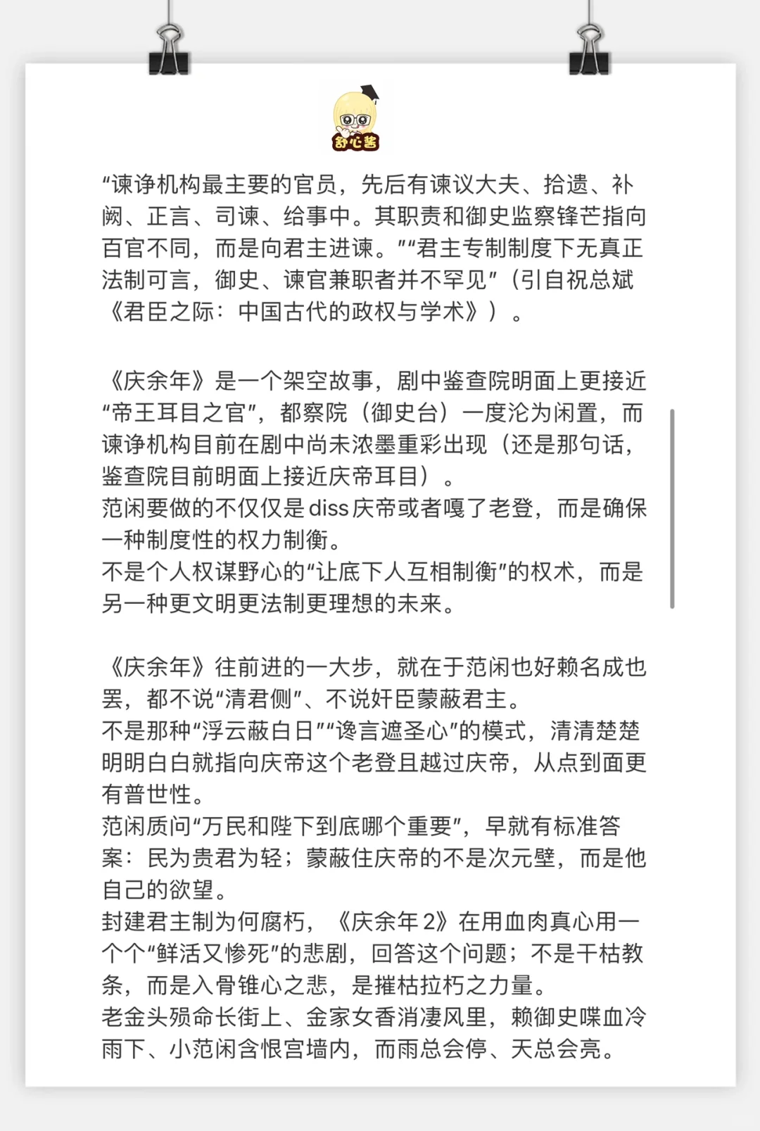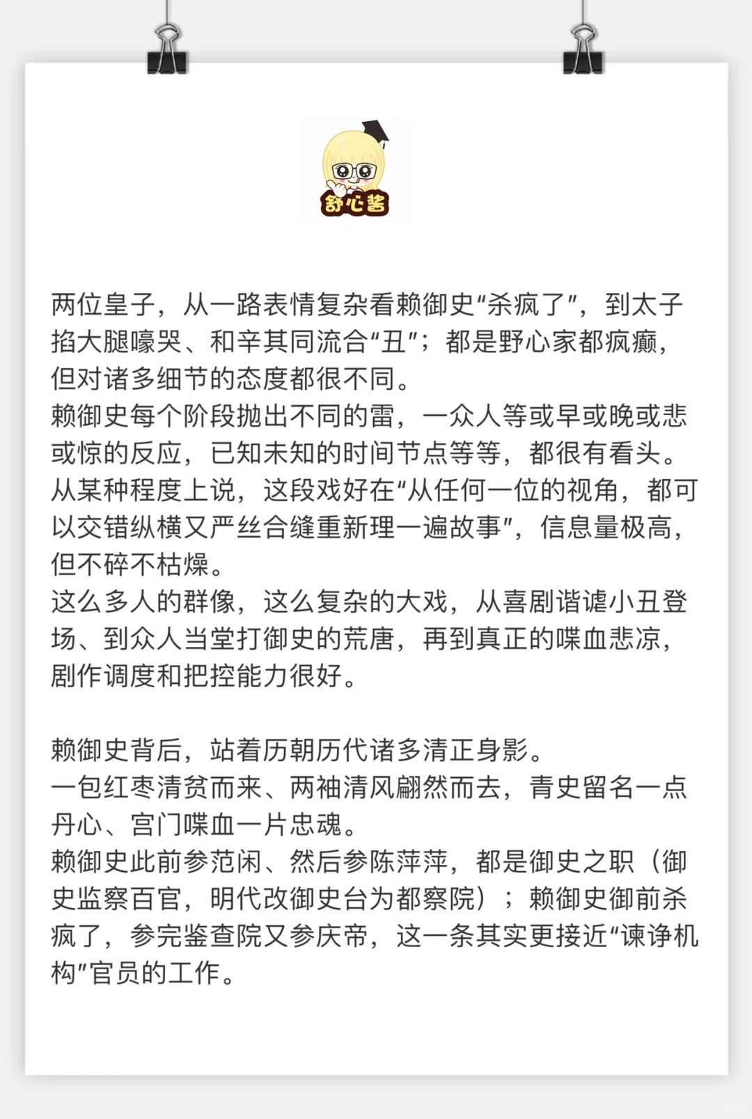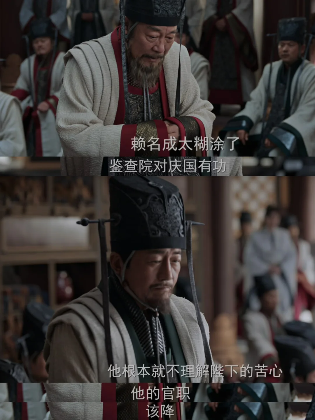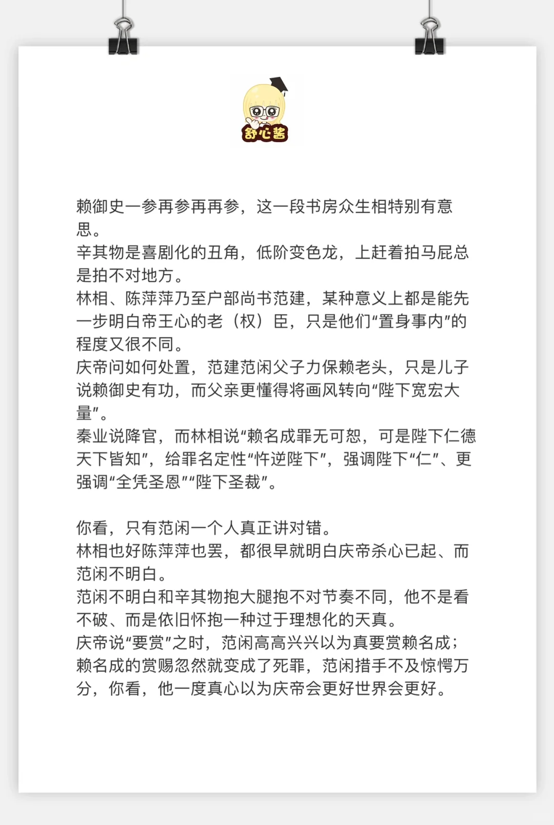 赖名成表面上是个颇为迂腐的“傻读书人”,实际上某个部分和范闲一样,诉求是“绝对权力的去绝对化”,是“对凌驾于一切之上的帝制皇权的监督”。