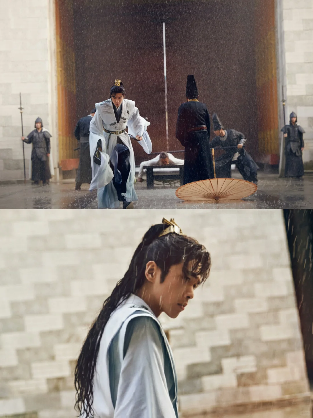 这一段里宫殿建筑、乃至雨水雨伞,虽则无言、但也都是表达的有机部分、共同构成了喋血悲凉画卷。