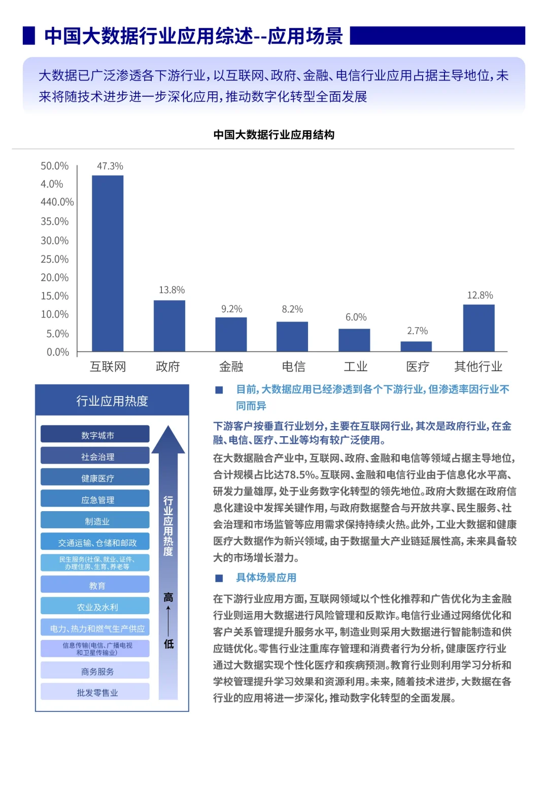 在大数据融合产业里,互联网、政府、金融和电信等领域可是占据主导地位的,合计规模占比达到了 78.5%!互联网、金融和电信行业因为信息化水平高、研发力量强,处在业务数字化转型的领先位置。政府大数据在政府信息化建设中起着关键作用,和政府数据整合与开放共享、民生服务、社会治理以及市场监管等应用需求一直都很热门🎉