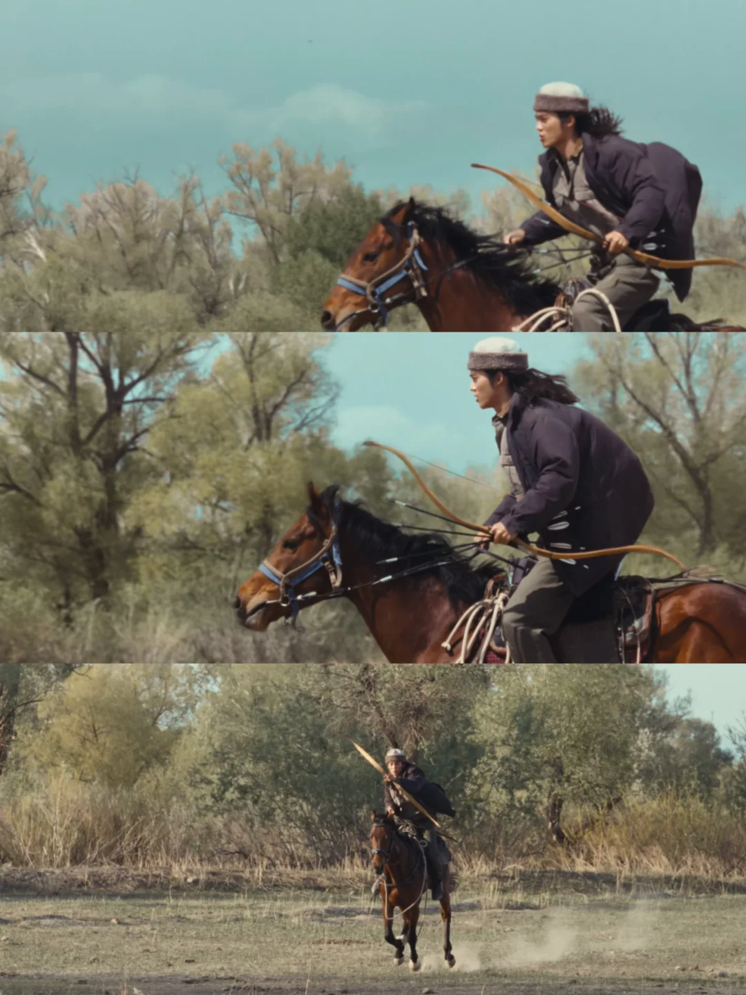 草原勇士骑马射箭追人,很孔武有力的画面,但也不是传统意义上真正的征服射杀,倒是裹着“两位误会吱哇乱叫”的喜剧皮面,带着“淳朴善良、没钱但是用珍贵的骆驼来抵债”的良善内核。你看,这就不仅仅是挽弓当挽强的力气大本领高,而让角色在“威武英气”之外有更多维度更多弧光。