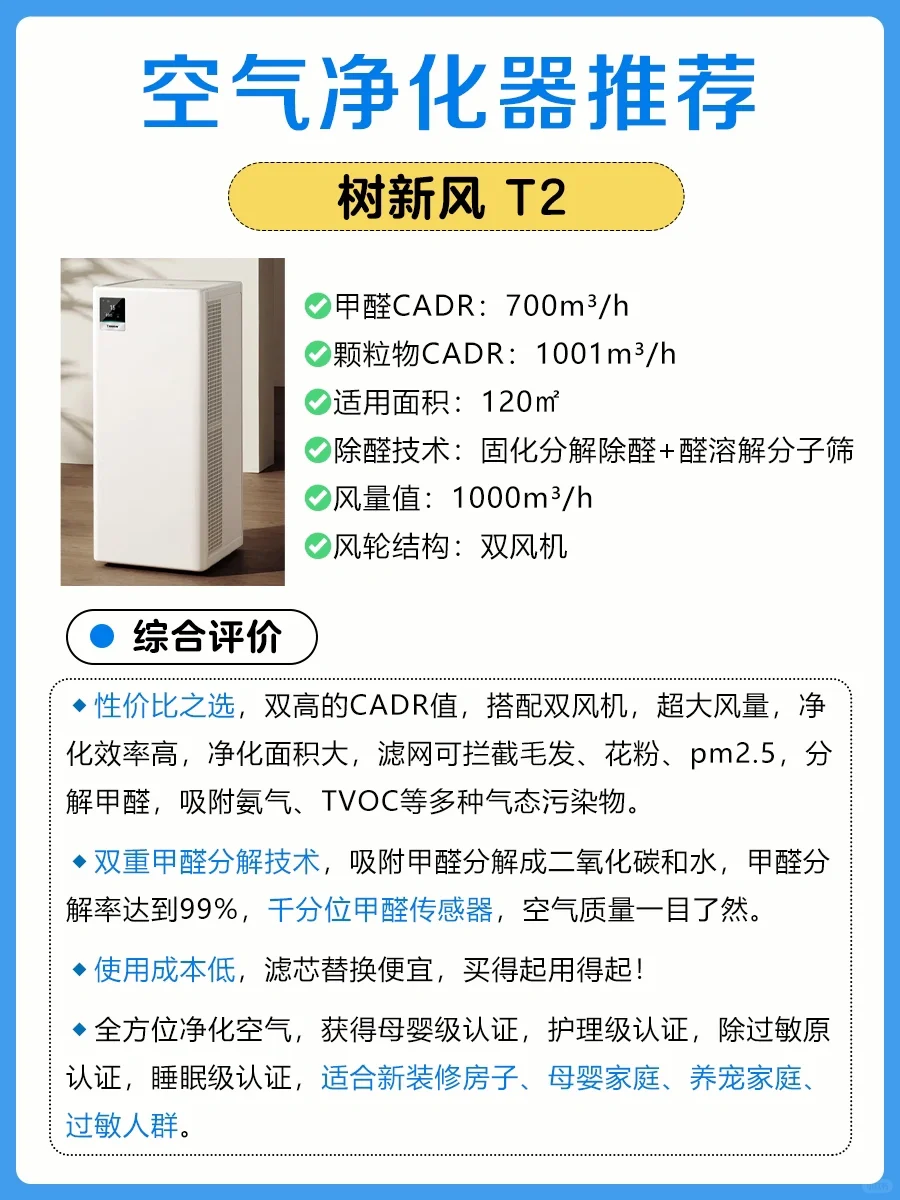 👉🏻亲测值得入手的高性价比净化器,树新风T2,性价比之选,双高的CADR值,搭配双风机,超大风量,净化效率高,净化面积大,滤网可拦截毛发、花粉、pm2.5,分解甲醛,吸附氨气、TVOC等多种气态污染物。