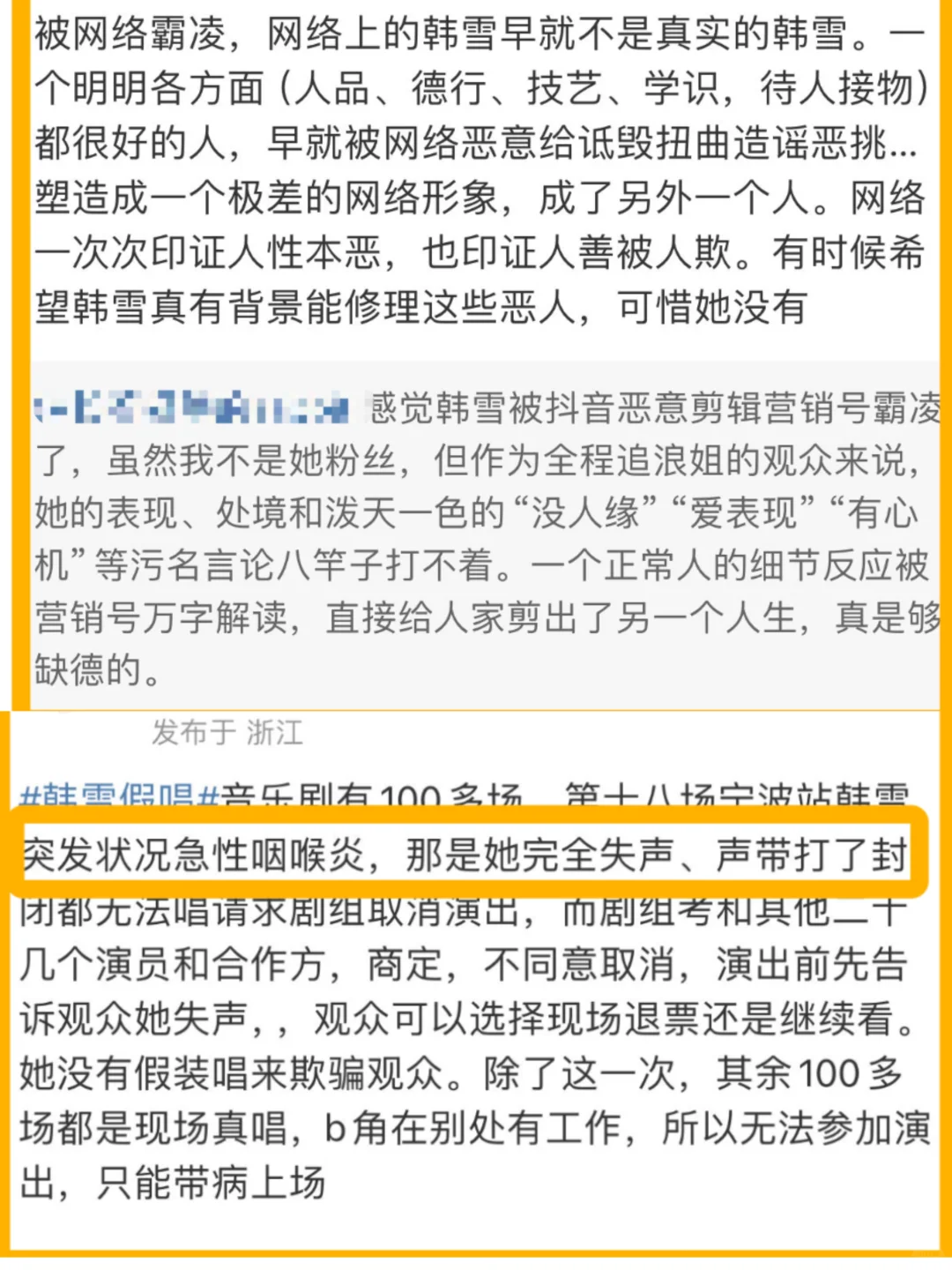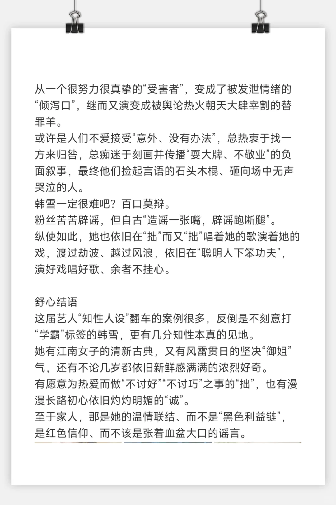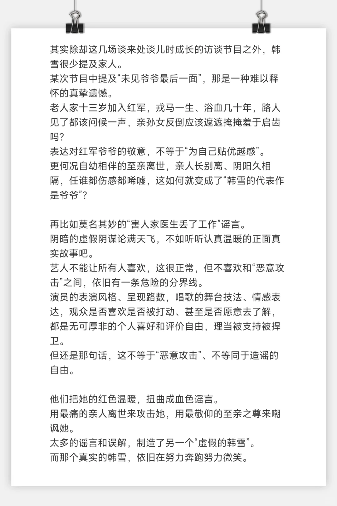 更荒唐的是,网络谣言四起,造谣韩雪“蹭《亮剑》李云龙”热度、谎称爷爷是他;又不听她的辟谣、忽略她的辩解,扣给她一顶反正横竖都是你错的大帽子