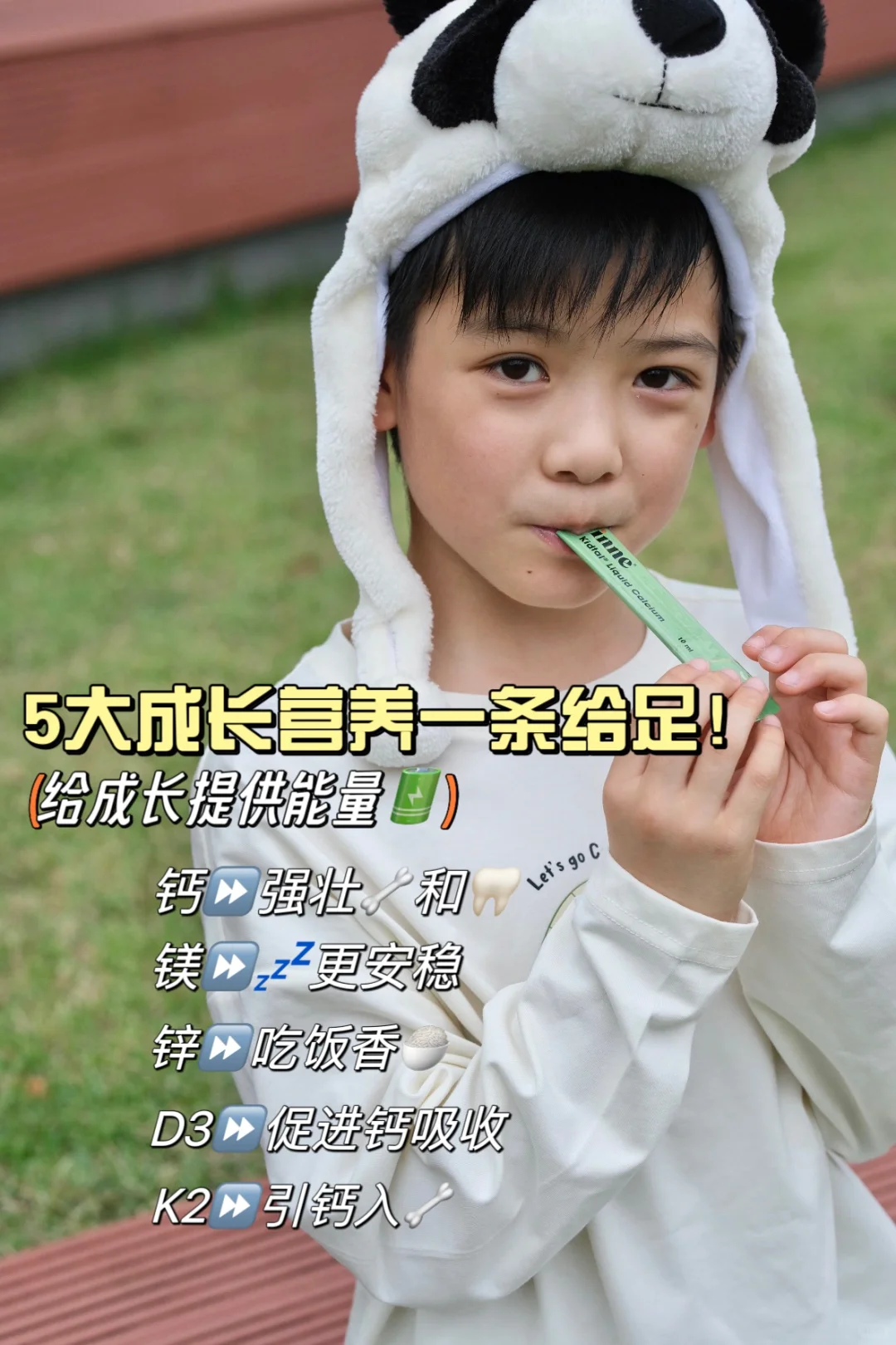 加上足量成骨因子,钙、镁、锌、D3和K2,好比成长燃料,可以提供充足的能量,让孩子生长持续续航!