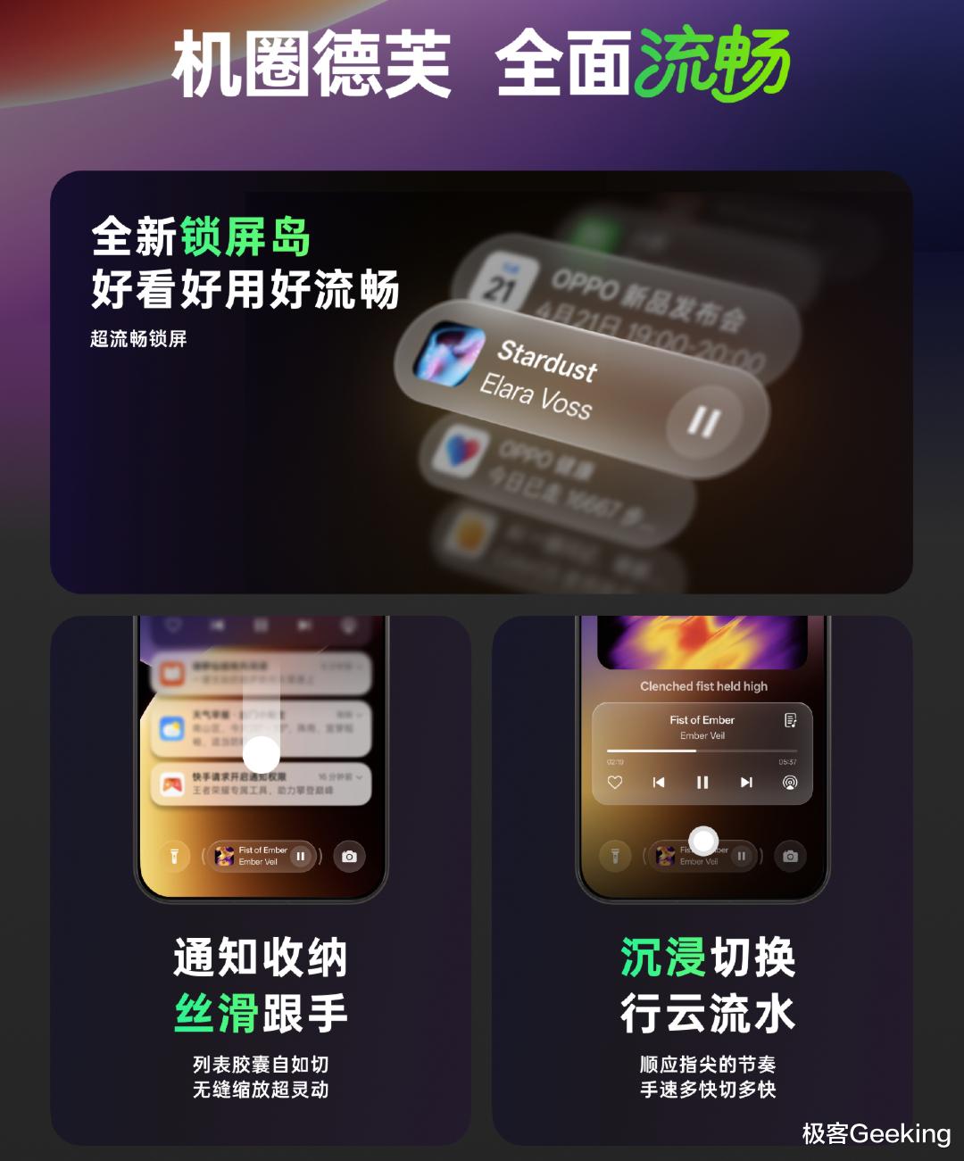 首先是对“机圈德芙,全面流畅”的加强,新一代 ColorOS 16 进一步在系统流畅上带来新体验,引入全新「锁屏岛」,不仅通知收纳丝滑跟手,而且沉浸切换行云流水,变得更加好看好用更流畅。