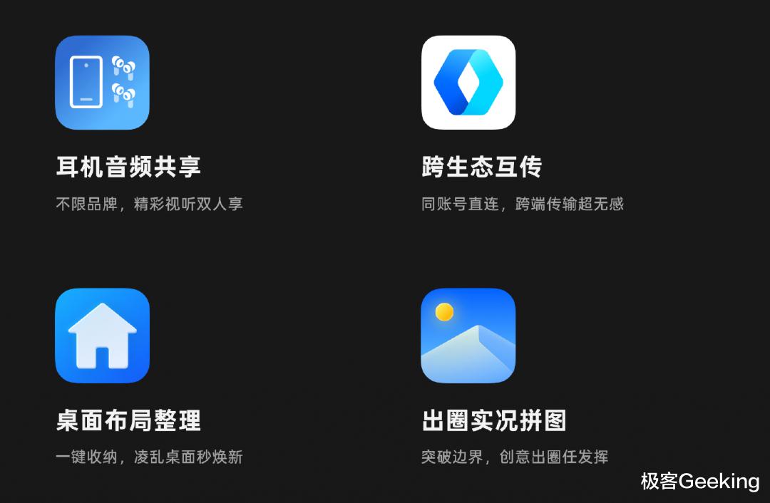 此外还新增了多项实用功能,包括耳机音频共享、跨生态互传、桌面布局整理和出圈实况拼图。