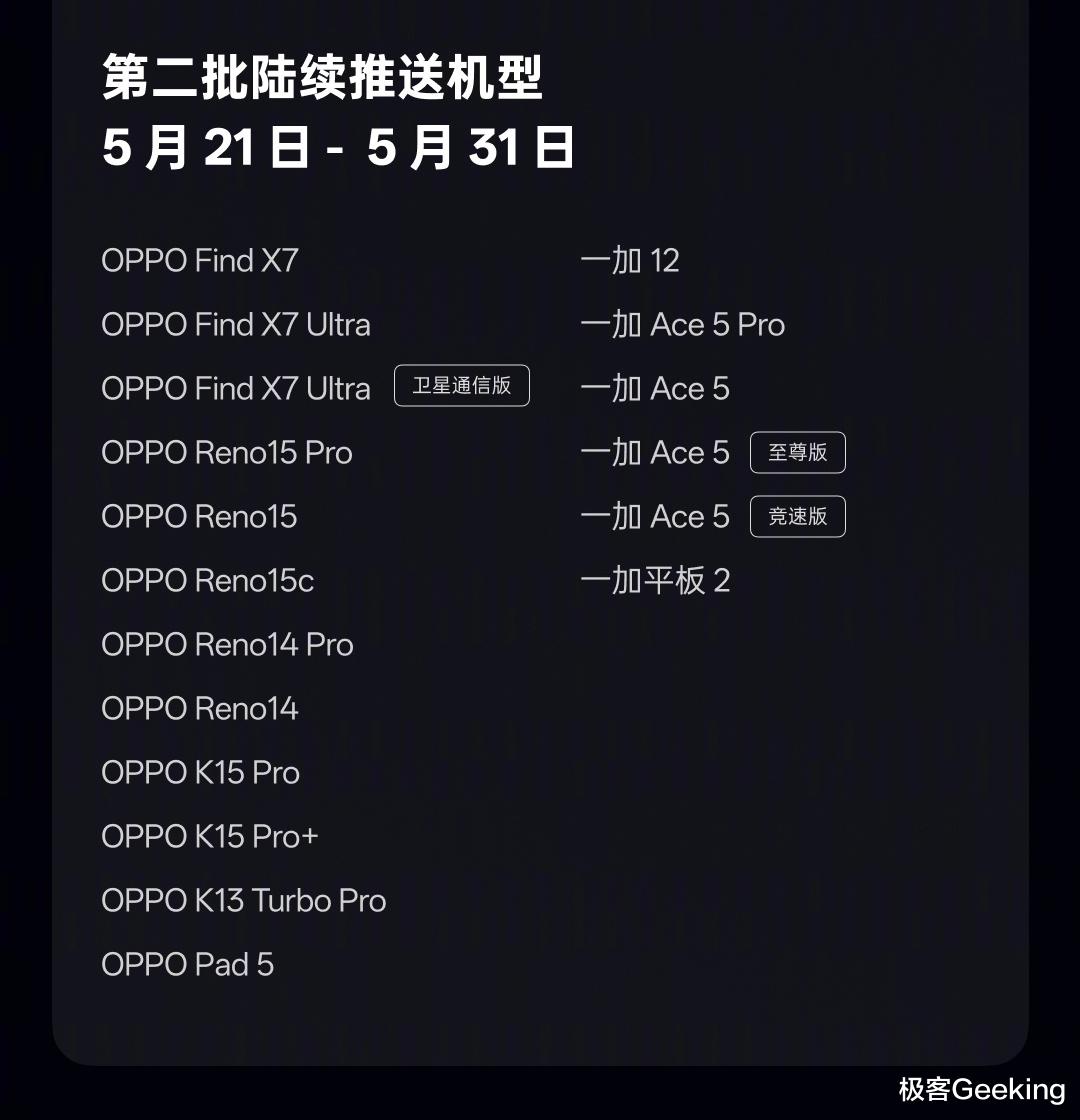 第二批共支持 18 款机型,主要包括 OPPO Find X7、Reno 15/14、K15 Pro、一加12 和 Ace 5 等系列机型,将在 5 月 21 日到 31 日开启推送升级。完整的机型名单如下: