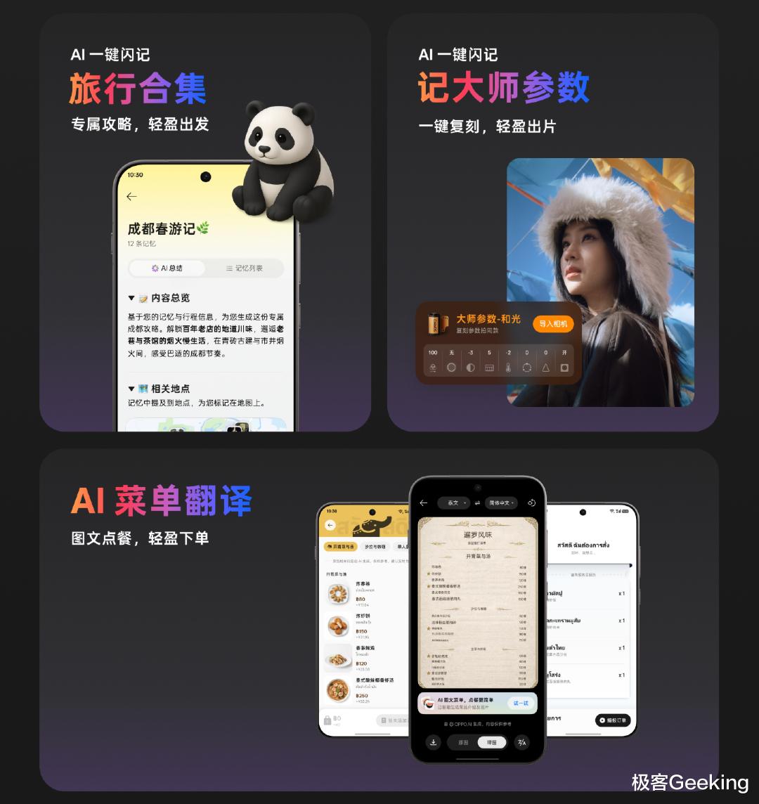 系统 AI 新增了「一键闪记」新玩法,能总结旅行合集和记相机大师参数一键复刻,AI 菜单翻译则是实现了图文点餐。