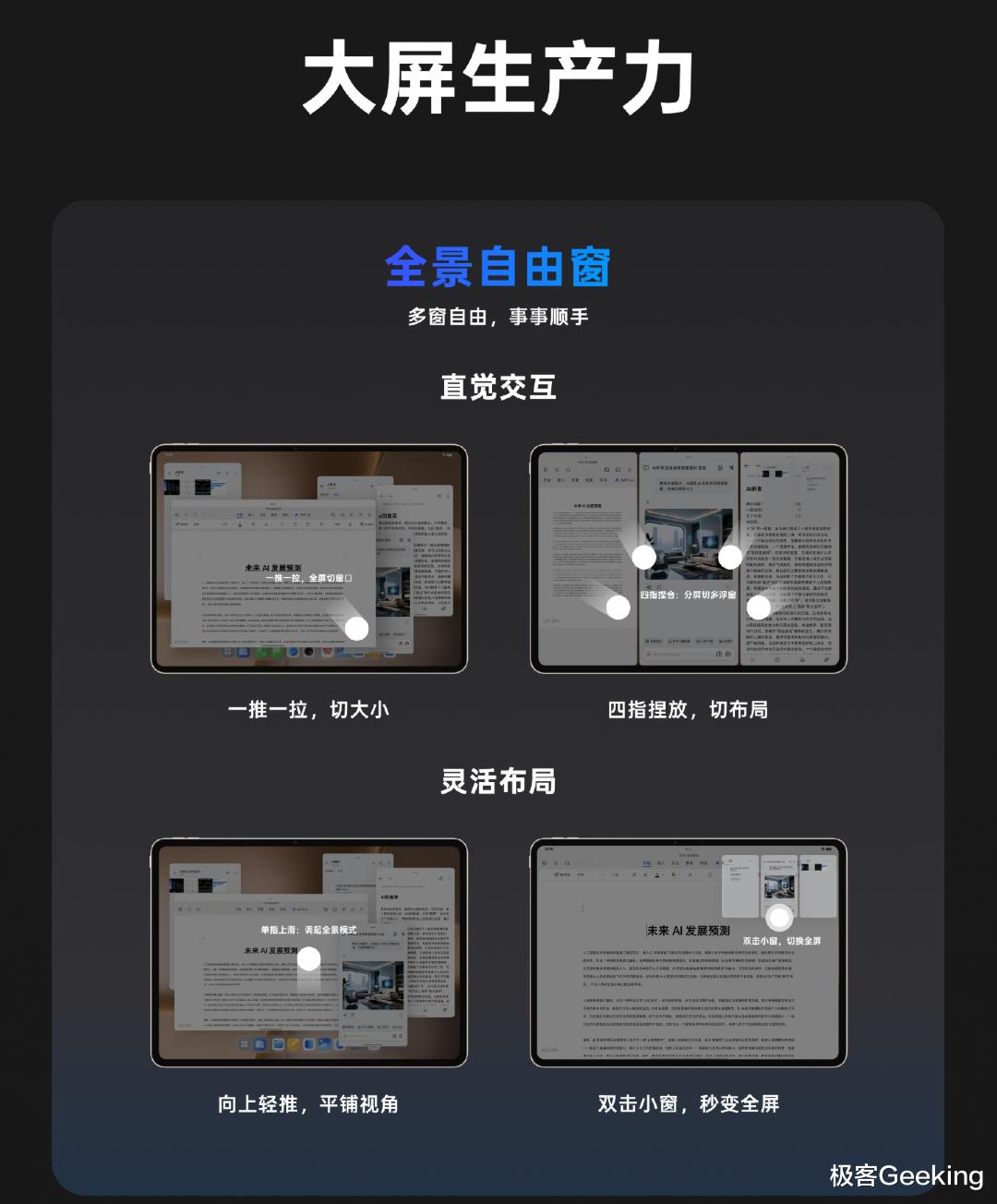 新一代 ColorOS 16 进一步适配优化了平板电脑等大屏设备,支持全景自由窗,提升大屏生产力效率。