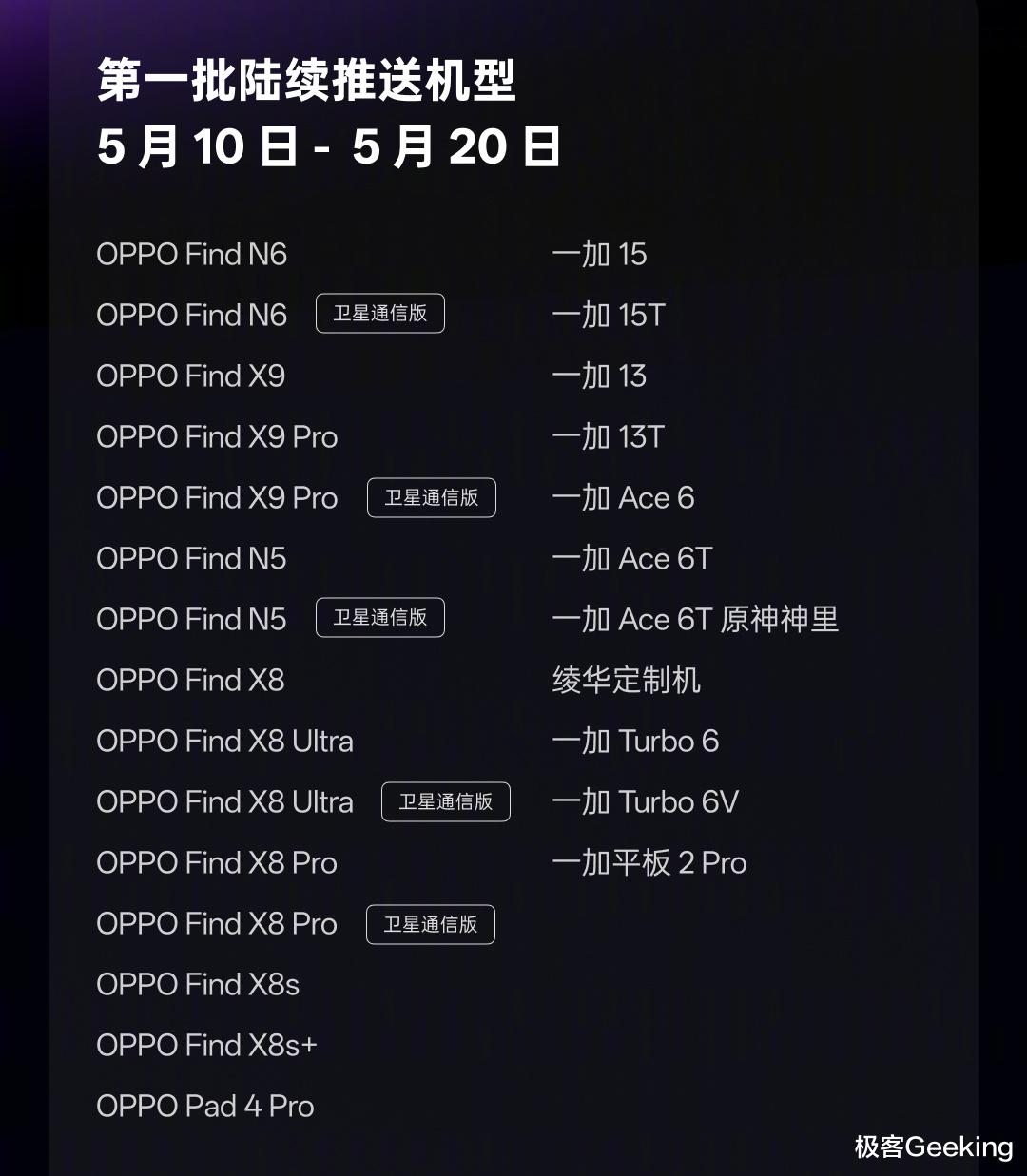 第一批共支持 25 款手机和平板机型,主要包括 OPPO Find X9、Find X8、Find N5 折叠屏、一加15、一加13、Ace6 和 Turbo 6 等系列机型,将在 5 月 10 日到 20 日开启推送升级。完整的机型名单如下: