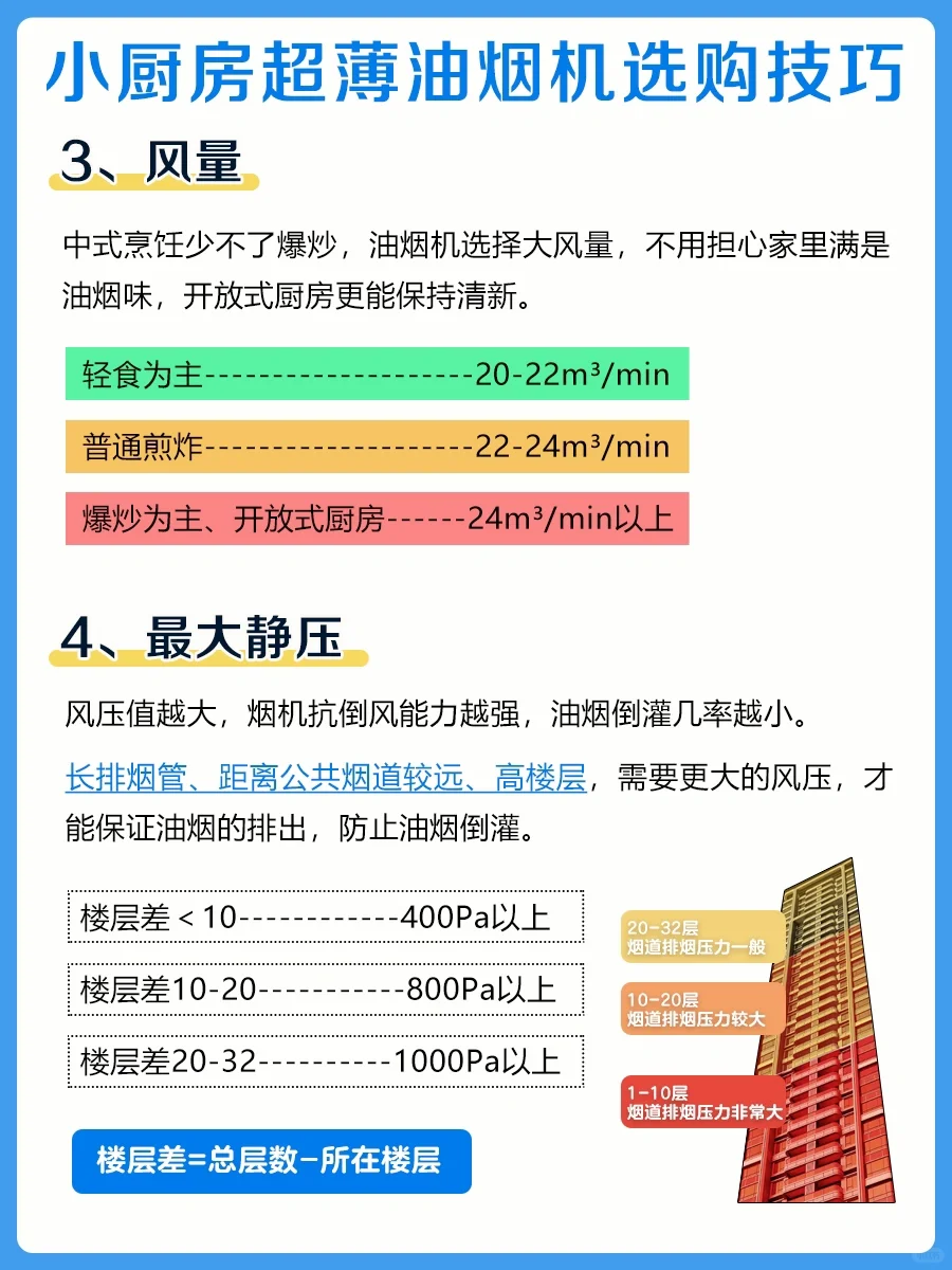 长排烟管、距离公共烟道较远、高楼层,需要更大的风压,才能保证油烟的排出,防止油烟倒灌。