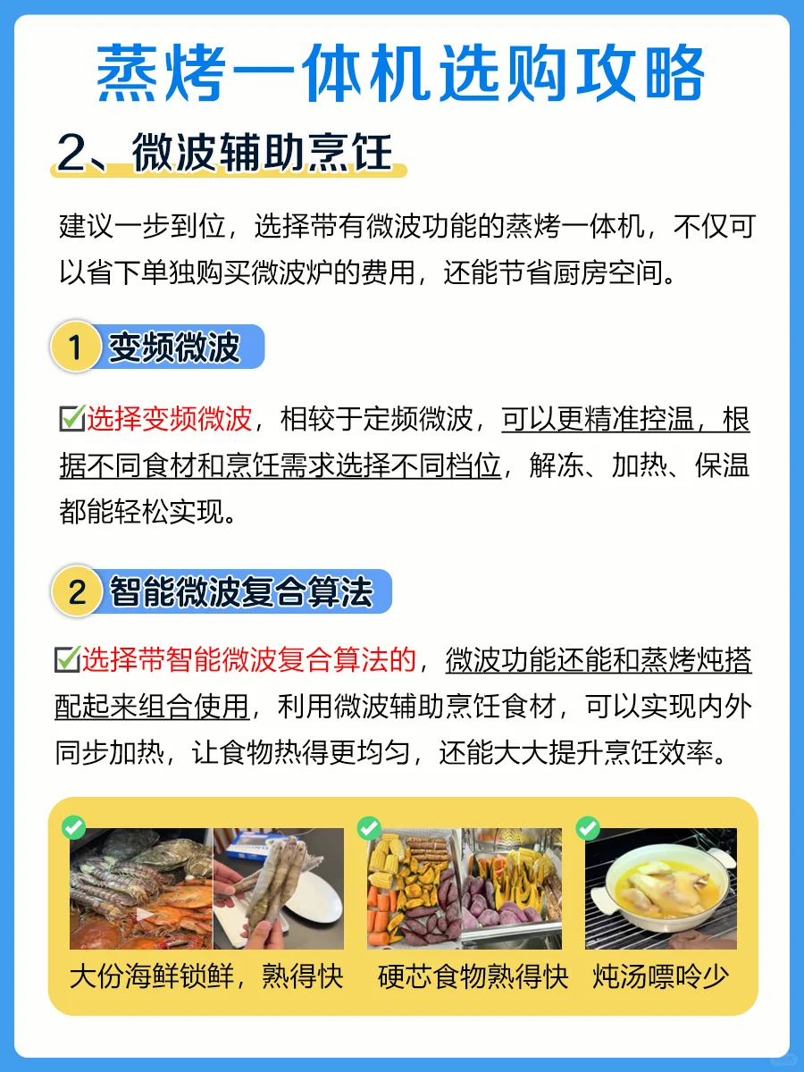 ✅选带智能微波复合算法的,微波功能还能和蒸烤炖搭配起来组合使用,利用微波辅助烹饪食材,可以实现内外同步加热,让食物热得更均匀,还能大大提升烹饪效率。