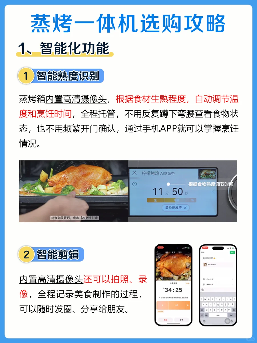 ✅选带智能熟度识别功能的,蒸烤箱内置高清摄像头,根据食材生熟程度,自动调节温度和烹饪时间,全程托管,不用反复蹲下弯腰查看食物状态,也不用频繁开门确认,通过手机APP就可以掌握烹饪情况。