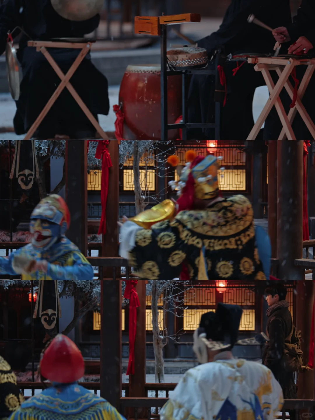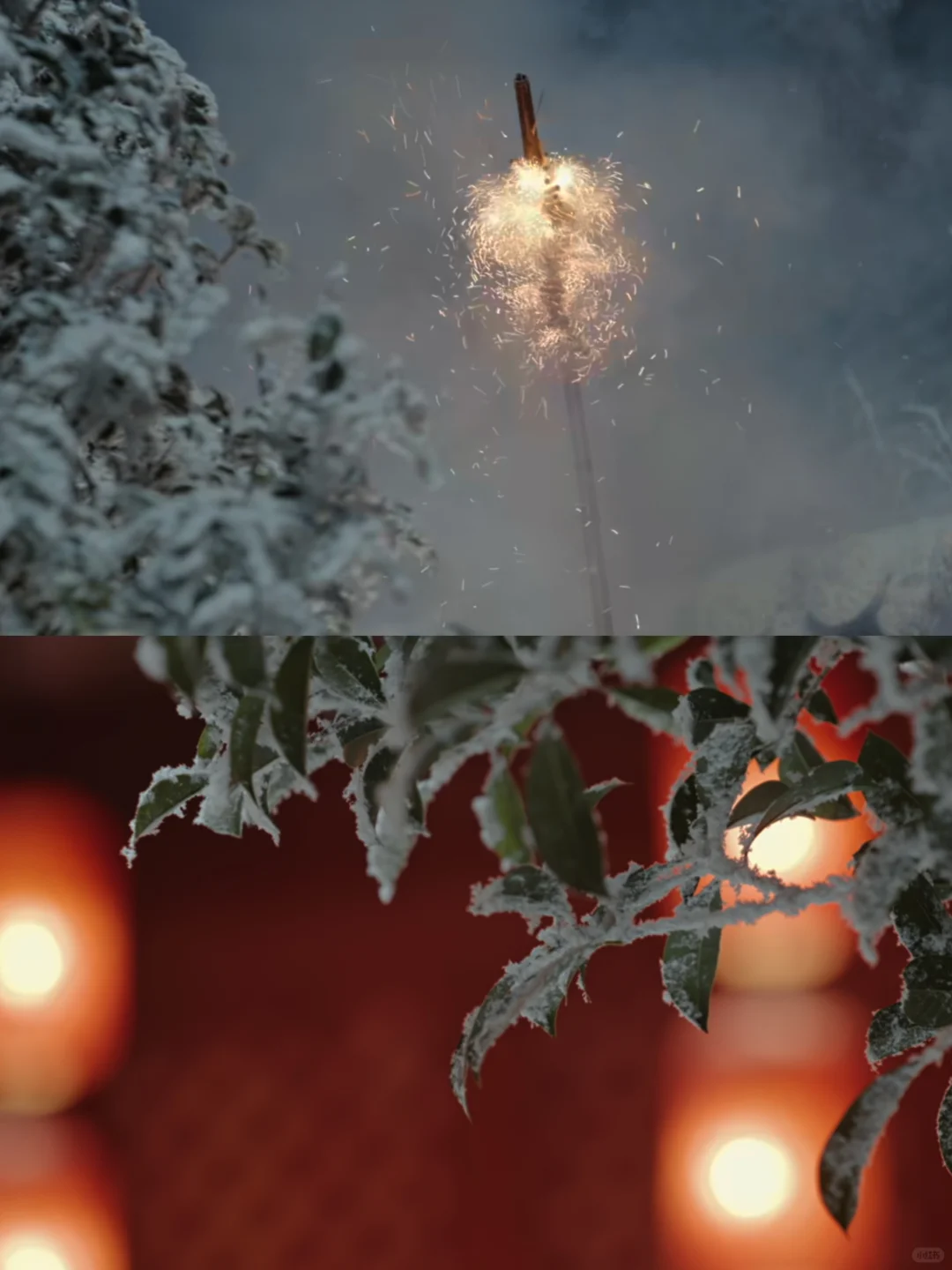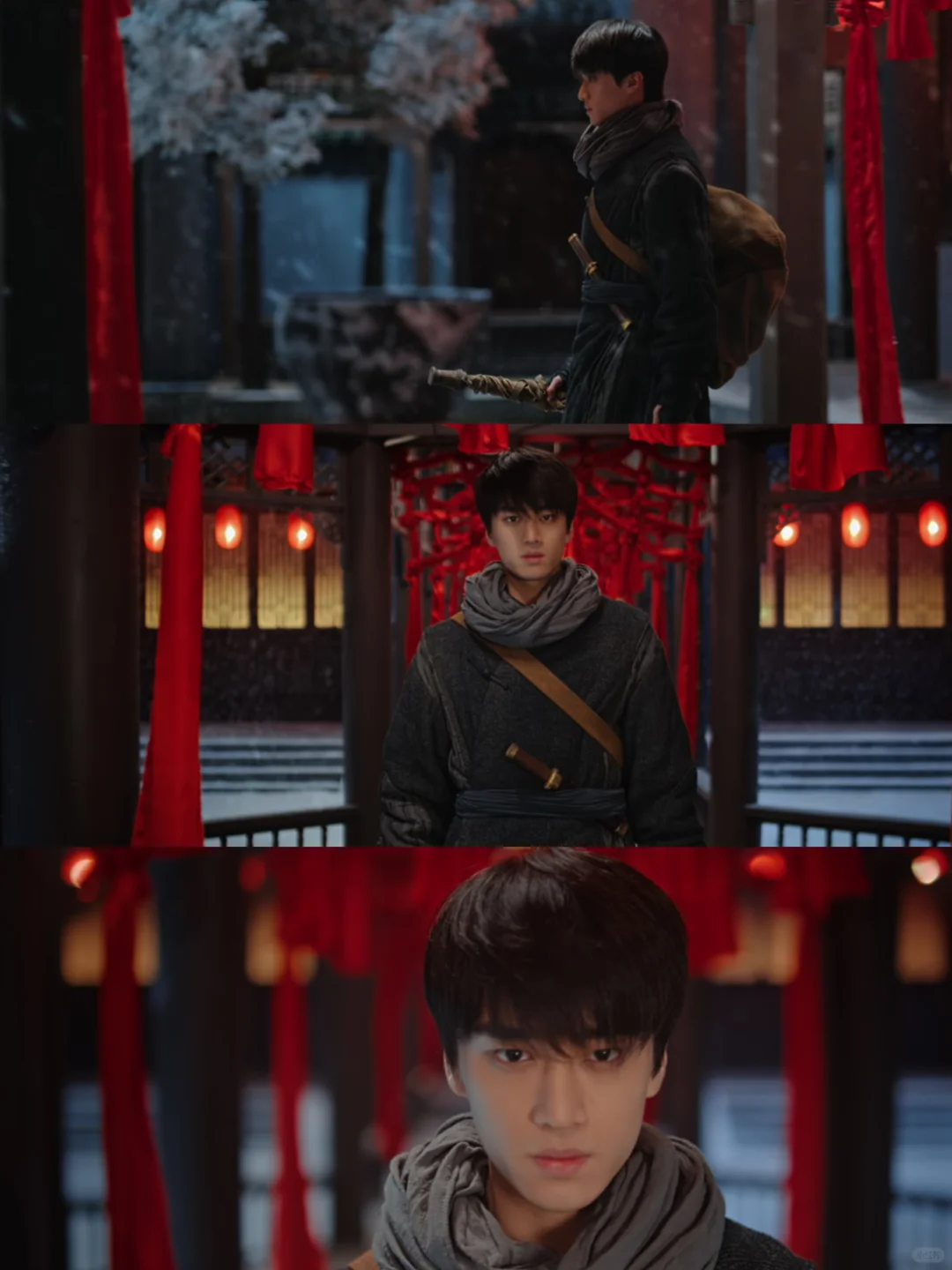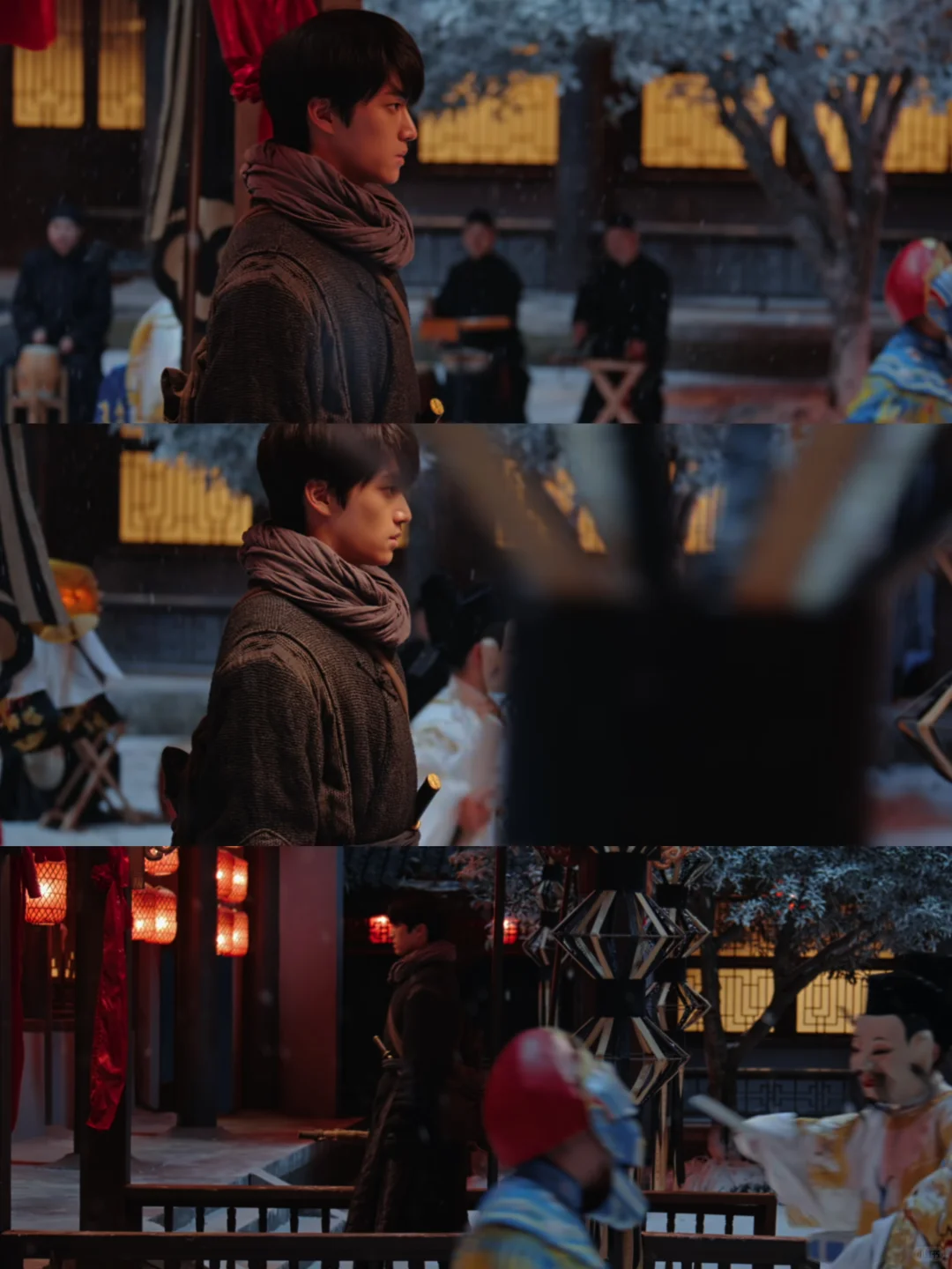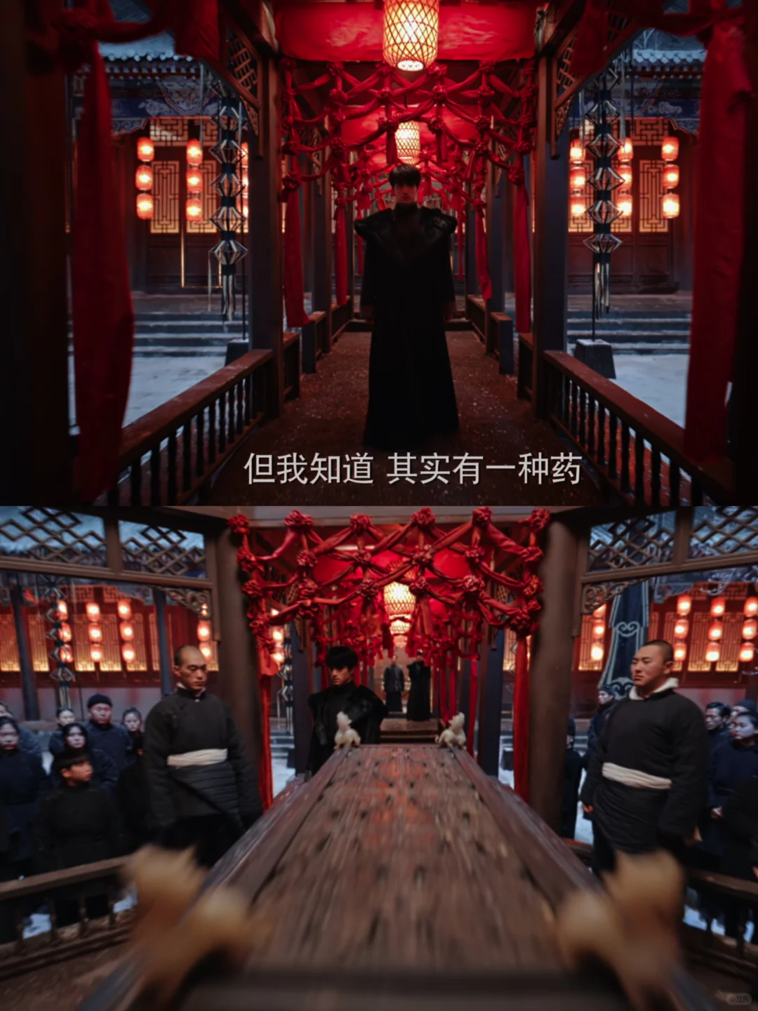 一边是大红灯笼高高挂、殷红如血处处“喜”,一边是白雪凄凄满枝头、森冷无言寒冬无尽。少年从长长的长廊走走过,走过鲜红的灯笼和结、走过热闹的戏剧锣鼓
