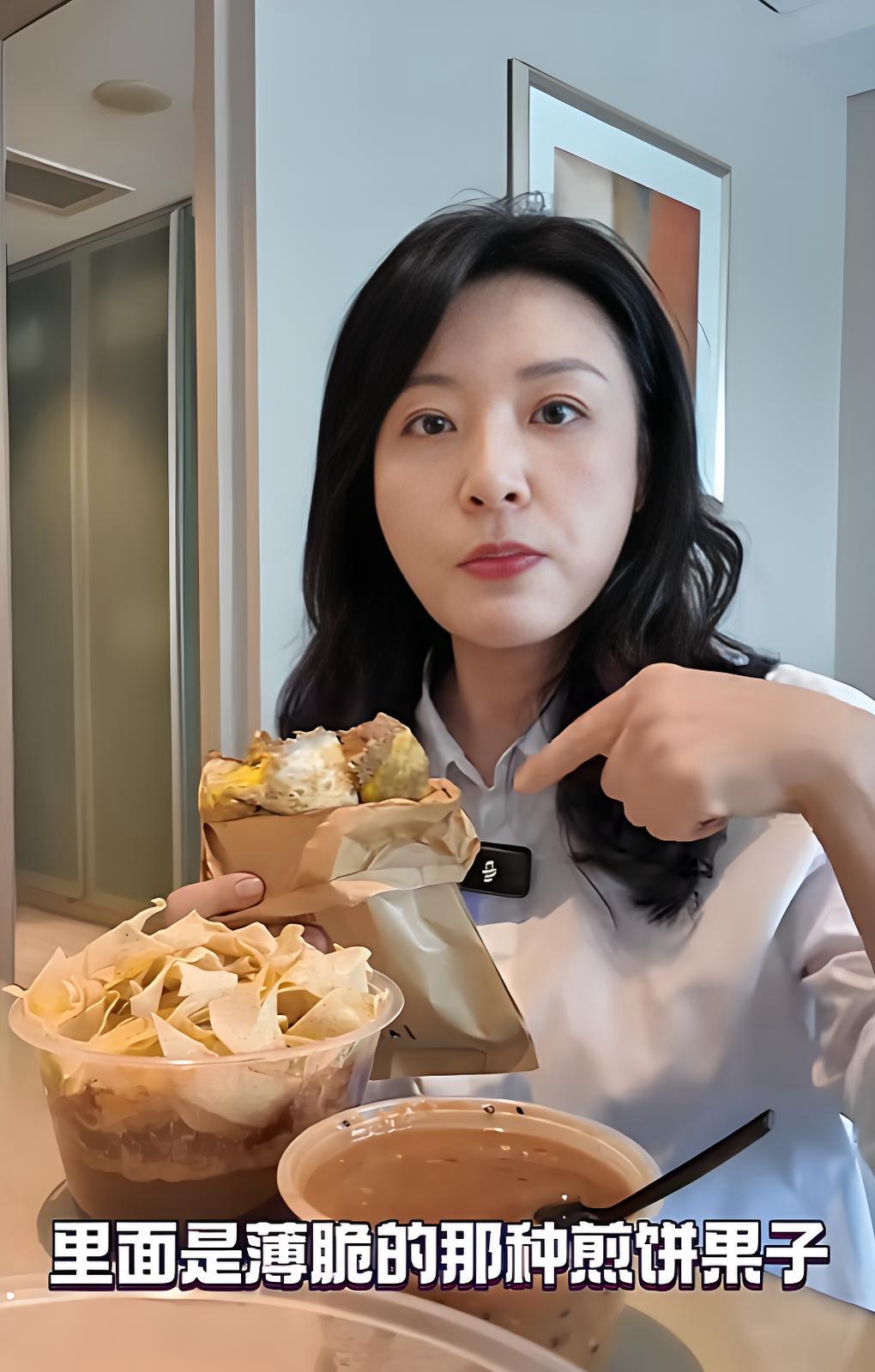 周涛在天津吃正宗的煎饼果子,她要3套,是绿豆面做的。她边吃边用天津话介绍:闻着就香。咬起来有“嘎吱,嘎吱”的薄脆声音,解压又幸福,太香了!