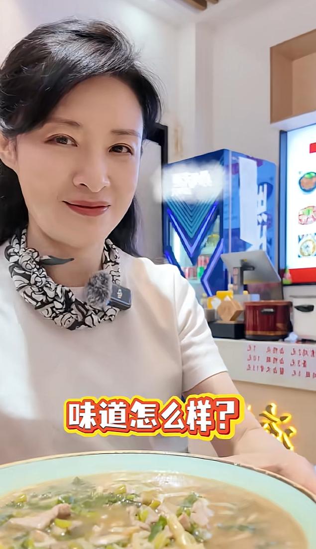 在杭州探店时,周涛吃著名的片儿川。她点了满满一大碗,先喝汤,再吃面条,味道鲜美极了。