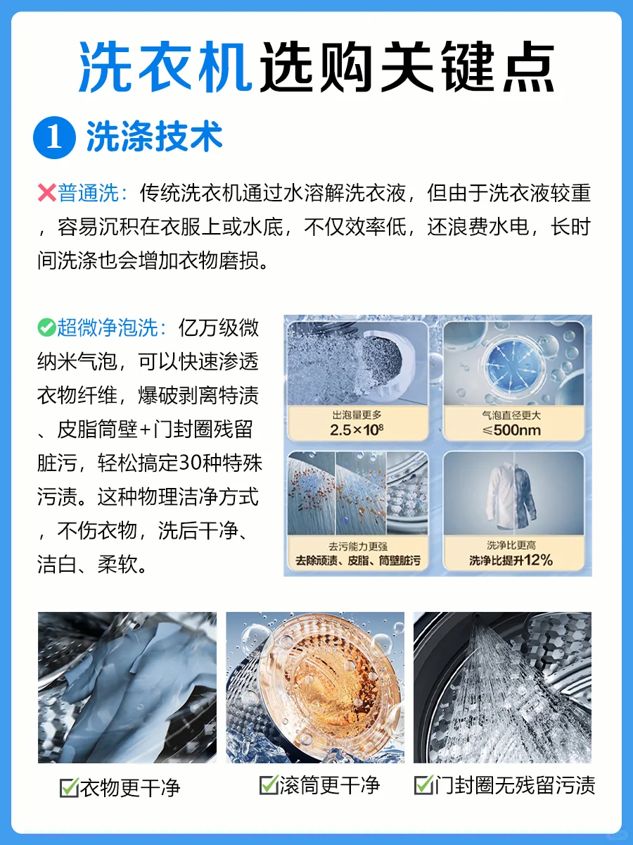 超微净泡洗:亿万级微纳米气泡,可以快速渗透衣物纤维,爆破剥离特渍、皮脂筒壁+门封圈残留脏污,轻松搞定30种特殊污渍。物理洁净不伤衣物,洗后干净、洁白、柔软。