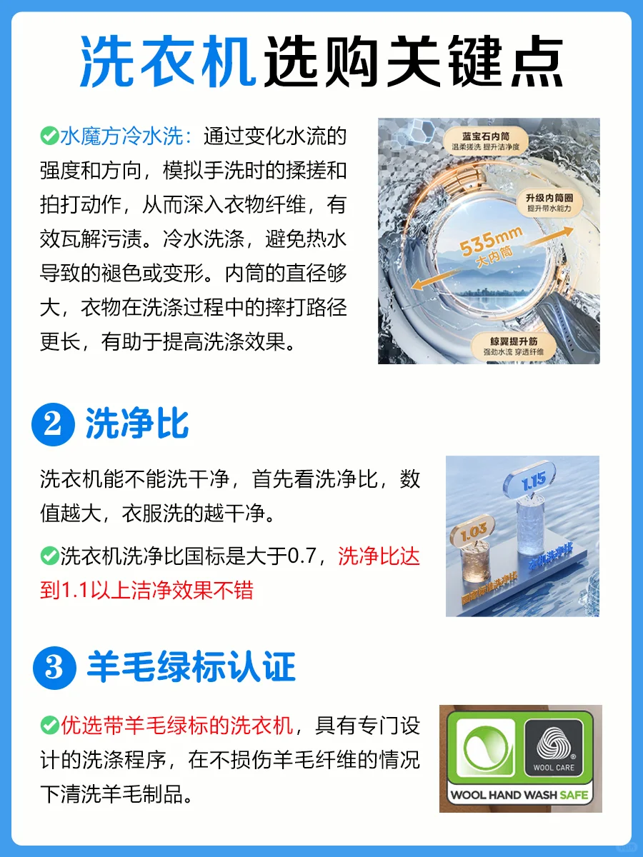 水魔方冷水洗:模拟手洗时的揉搓和拍打动作,有效瓦解污渍,冷水洗涤,避免褪色或变形,大筒径提高洗涤效果。